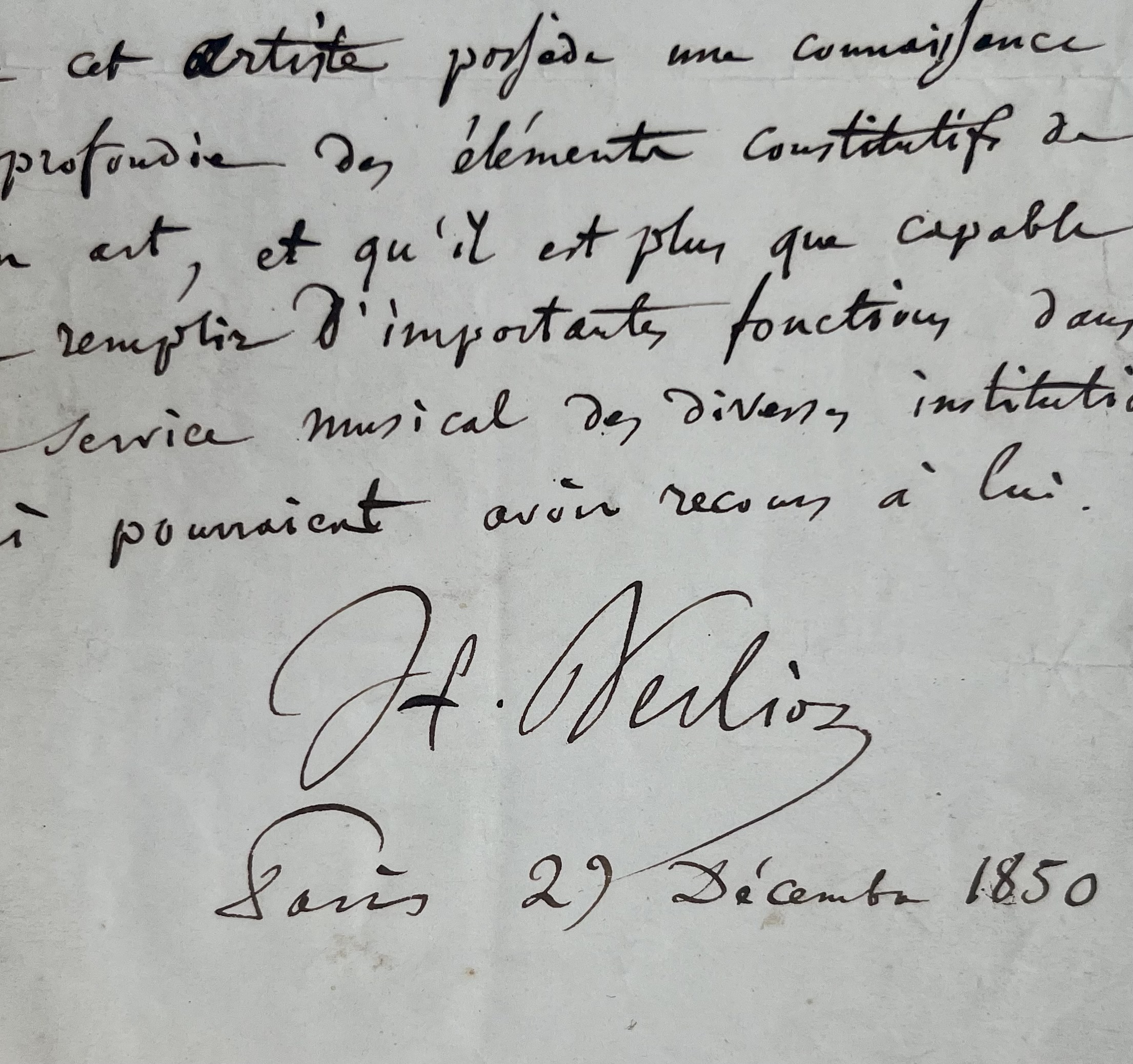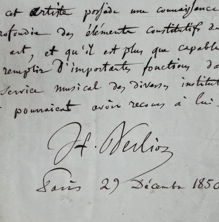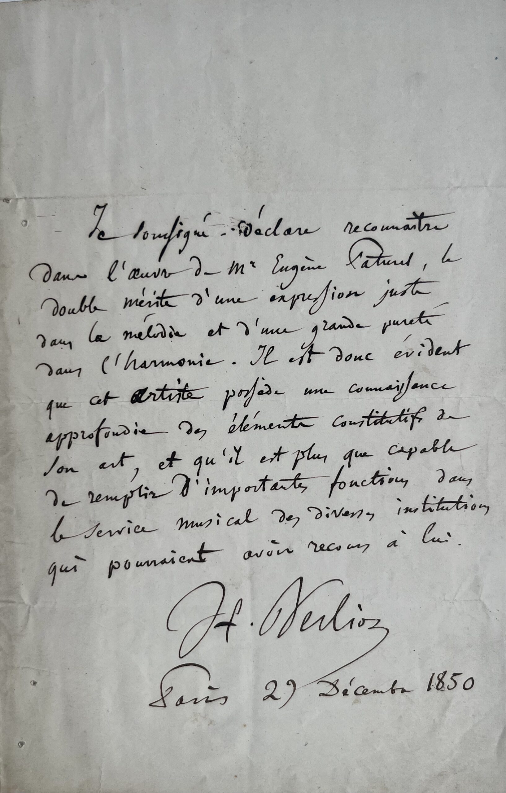"Je soussigné déclare reconnaître dans l'oeuvre de Mr Eugène Paturel, le double mérite d'une expression juste dans la mélodie et d'une grande pureté dans l'harmonie. Il est donc évident que cet artiste possède une connaissance approfondie des éléments constitutifs de son art, et qu'il est plus que capable de remplir d'importantes fonctions dans le service musical des diverses institutions qui pourraient avoir recours à lui".