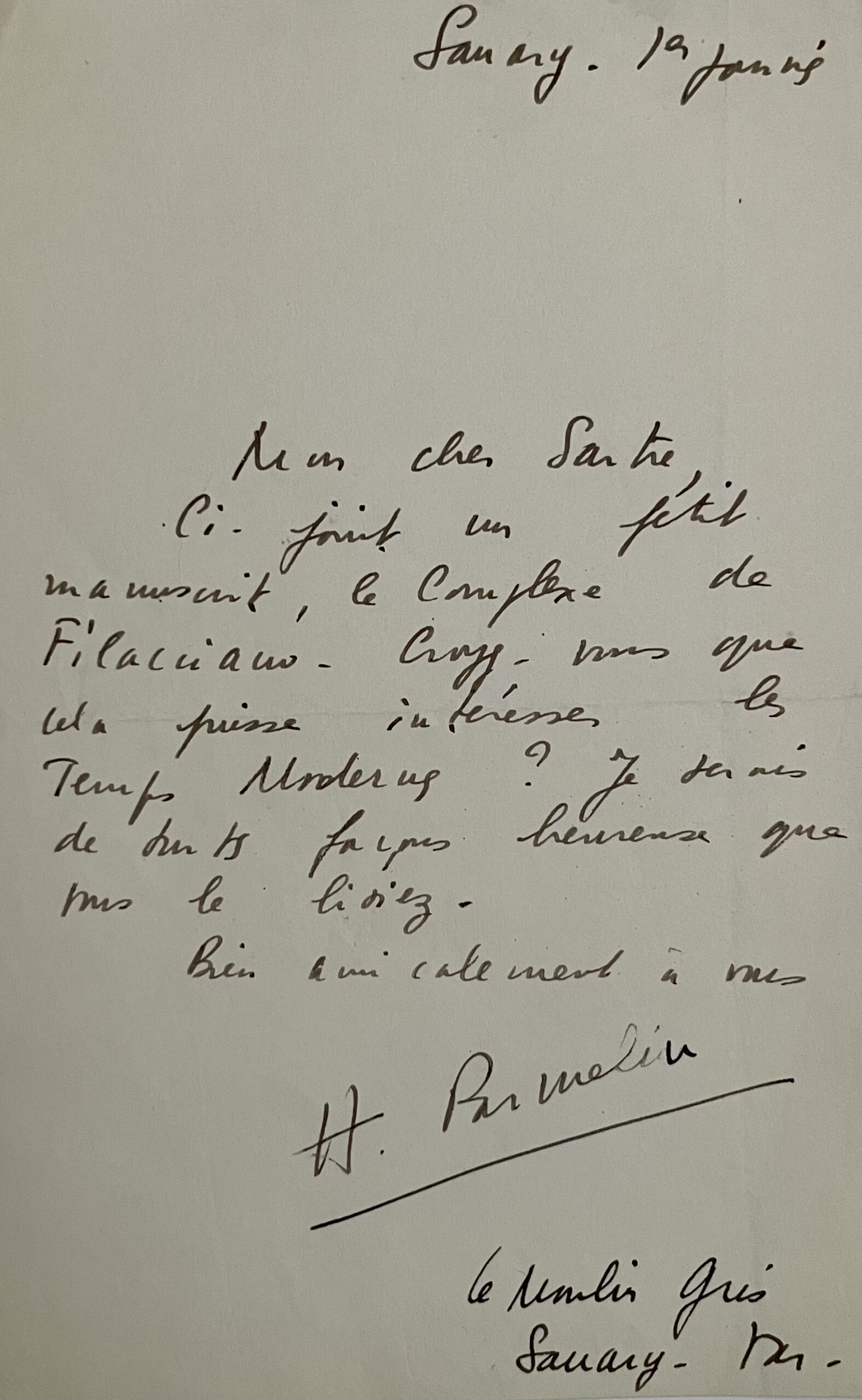 "Mon cher Sartre. Ci-joint un petit manuscrit, le Complexe de Filacciano. Croyez-vous que ça puisse intéresser les Temps Modernes [la revue fondée et dirigée par Sartre] ? Je serais de toutes façons heureuse que vous le lisiez. Bien amicalement à vous".