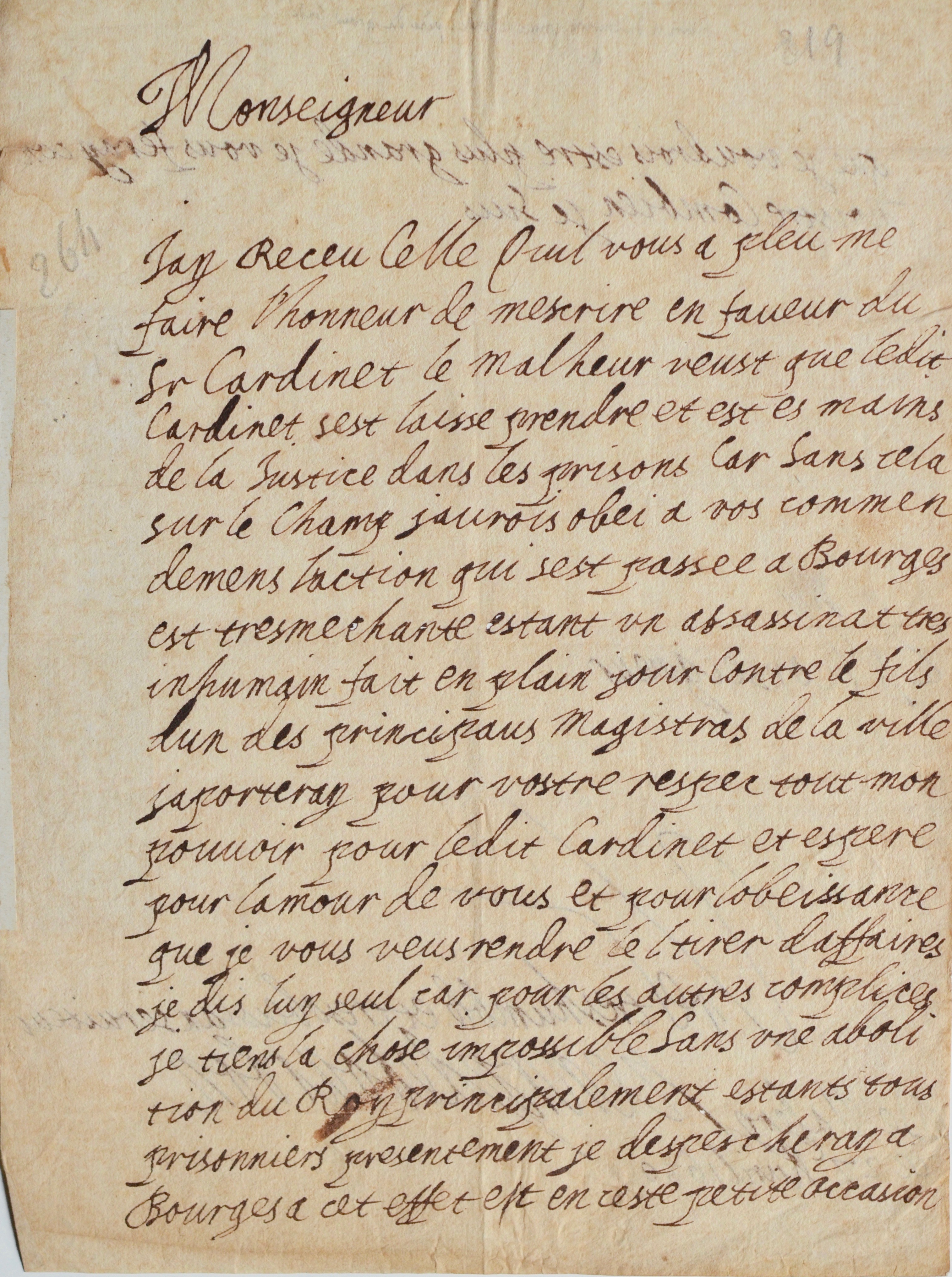 "Jay receu celle quil vous a pleu me faire l'honneur de mescrire en faveur du Sr Cardinet le malheur veut que ledit Cardinet sest laisse prendre et est es mains de la Justice dans les prisons car sans cela sur le champ jaurois obei a vos commendemens l'action qui sest passee a Bourges est très méchante estant un assassinat très inhumain fait en plein jour contre le fils dun des principaus magistras de la ville. Japorteray pour vostre respect tout mon pouvoir pour ledit Cardinet et espère pour lamour de vous et pour lobeissance que je vous veus rendre le tirer d'affaire. Je dis lui seul car pour les autres complices je tiens la chose impossible sans une abolition du Roy principalement estants tous prisonniers presentement je despescheray a Bourges a cet effet est en ceste petite occasion que je voudrois estre plus grande je vous feray connoistre combien je suis Monseigneur, votre très humble et très obeissan serviteur [...]".