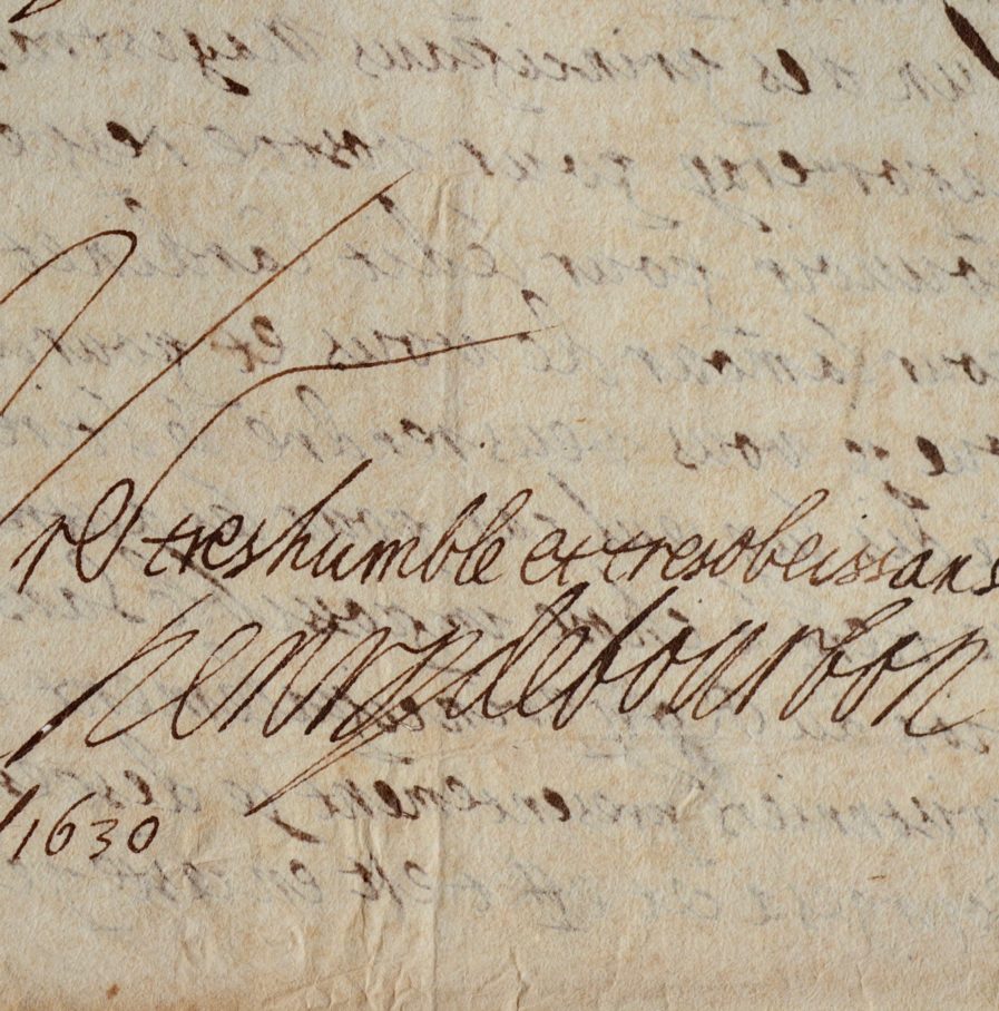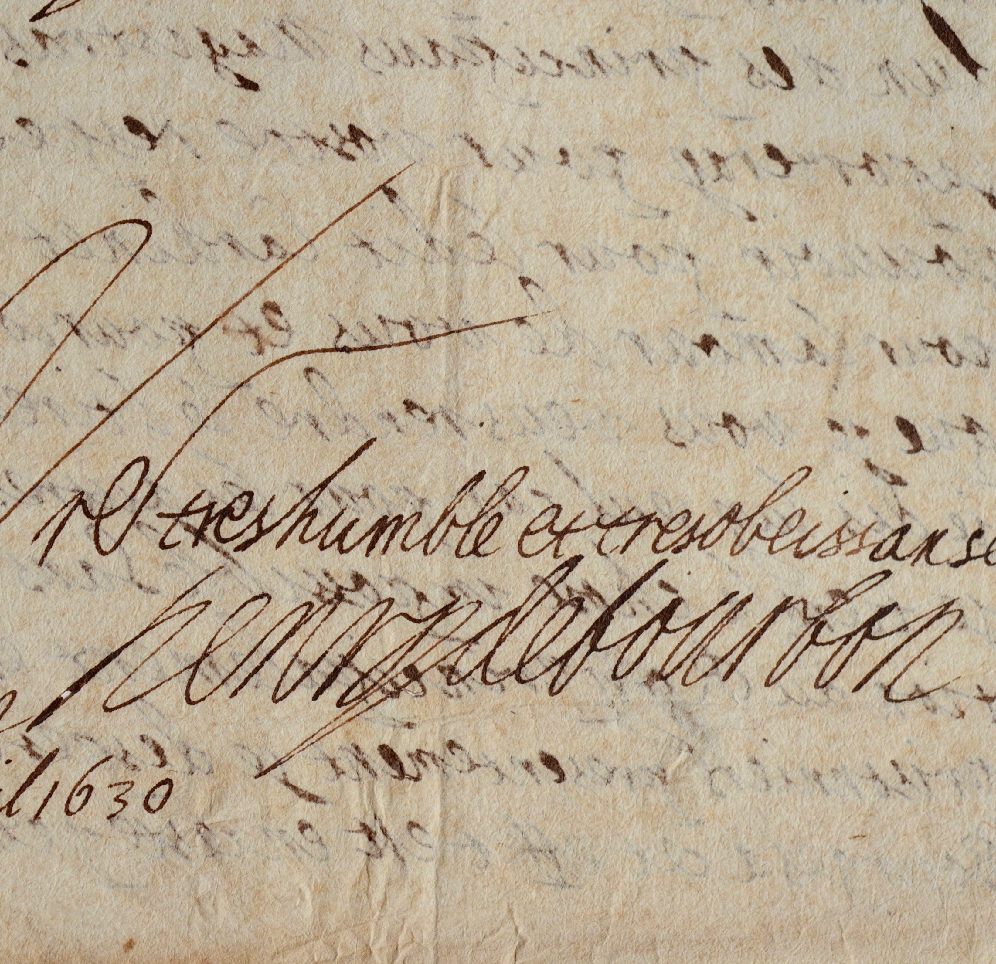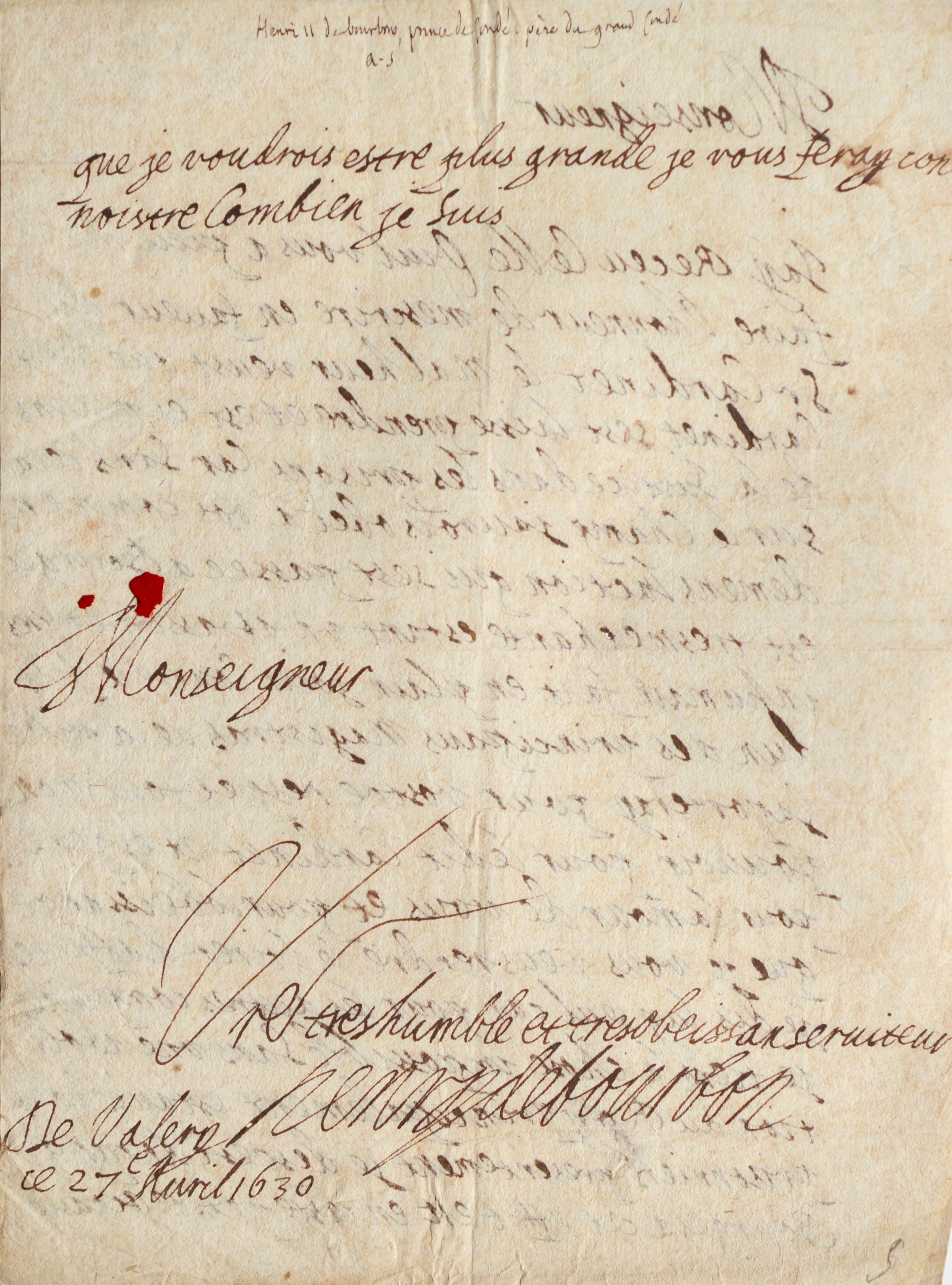 Henri II de Bourbon (Saint-Jean-d'Angély, 1588/1646)Étonnante lettre autographe signée d'Henri II de Condé. Il promet d'intervenir en faveur d'un assassin nommé Cardinet après que celui-ci ait tué le fils d'un important magistrat de la ville de Bourges, en reconnaissant toutefois que le crime fut atroce.