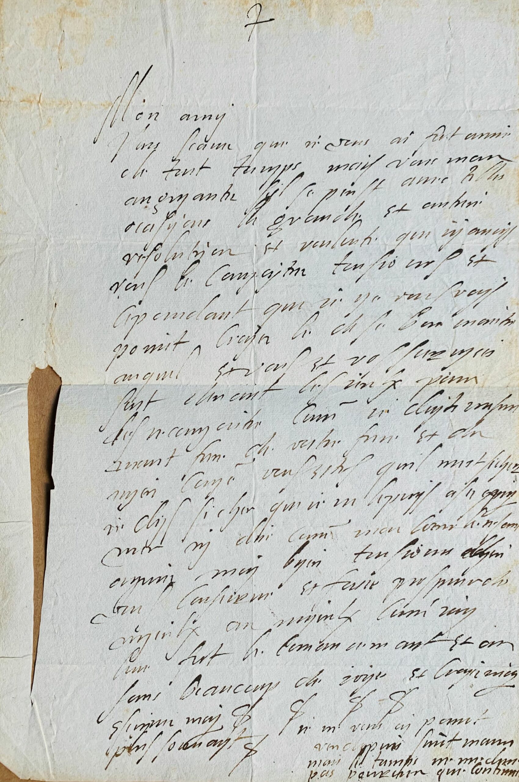 Vous scaves que je vous ai fort aimé en tout tamps mais vous m’an augmentes sil se peult avec telles ocasyons la grande et antière resolution et volonté que jy avoys vous le connaistes tousiours et cependant que ie ne vous voys poinct croyes le de se bon maistre auquel et vous et vos servyces sont devant les ieulx pour les reconnoistre comme ie doyts mesmement fere de vostre frere [Anne de Joyeuse, favori et l'un des "mignons" d'Henri III à partir de 1581, qui le comblera de faveurs] et du moyen comme vous estes quil mest si cher je dis si cher que ie ne le puys ases esprimer ny dire comme mon cœur le ressent. Aymes moy byen tousiours Dieu vous conserve et fasse et fasse prosperer de mieulx en mieulx comme iay byen fait le comancement et sans beaucoup de joye croyez moy. Escripves moy plus souvent. Ie ne vous ay poinct veu depuis huit mois mais le tamps ne me dure pas pourveu que continuez".
