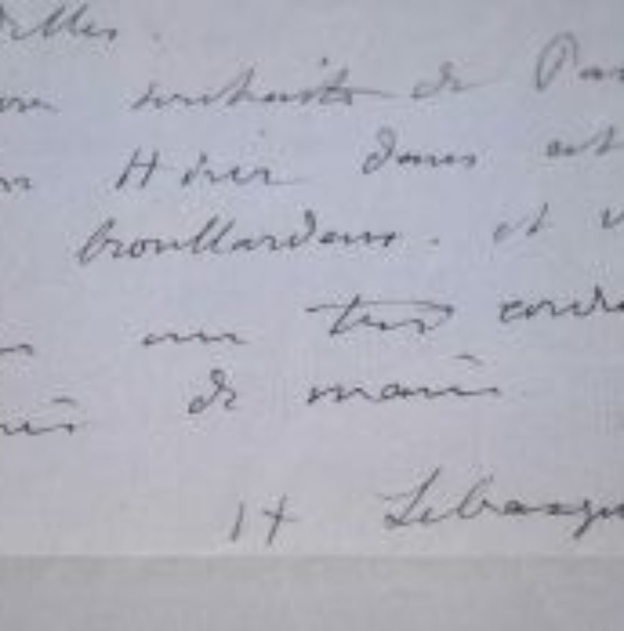 "Aujourd'hui veille de mon départ. J'espérais pouvoir venir vous voir ; mais avec cet affreux temps, je ne suis pas très bien et ne puis sortir. Vous me pardonnerez, parce que vous savez l'état de ma santé et mon médecin ne veut pas que je reste un jour de plus. Je n'oublie pas mes promesses. Je compte venir à Paris si le temps n'est pas trop mauvais, au mois de février. En tous cas, mon retour sera au printemps, comme les hirondelles. Je vous souhaite de passer un bon hiver dans cet affreux Paris brouillardeux. Et vous adresse une très cordiale poignée de main".