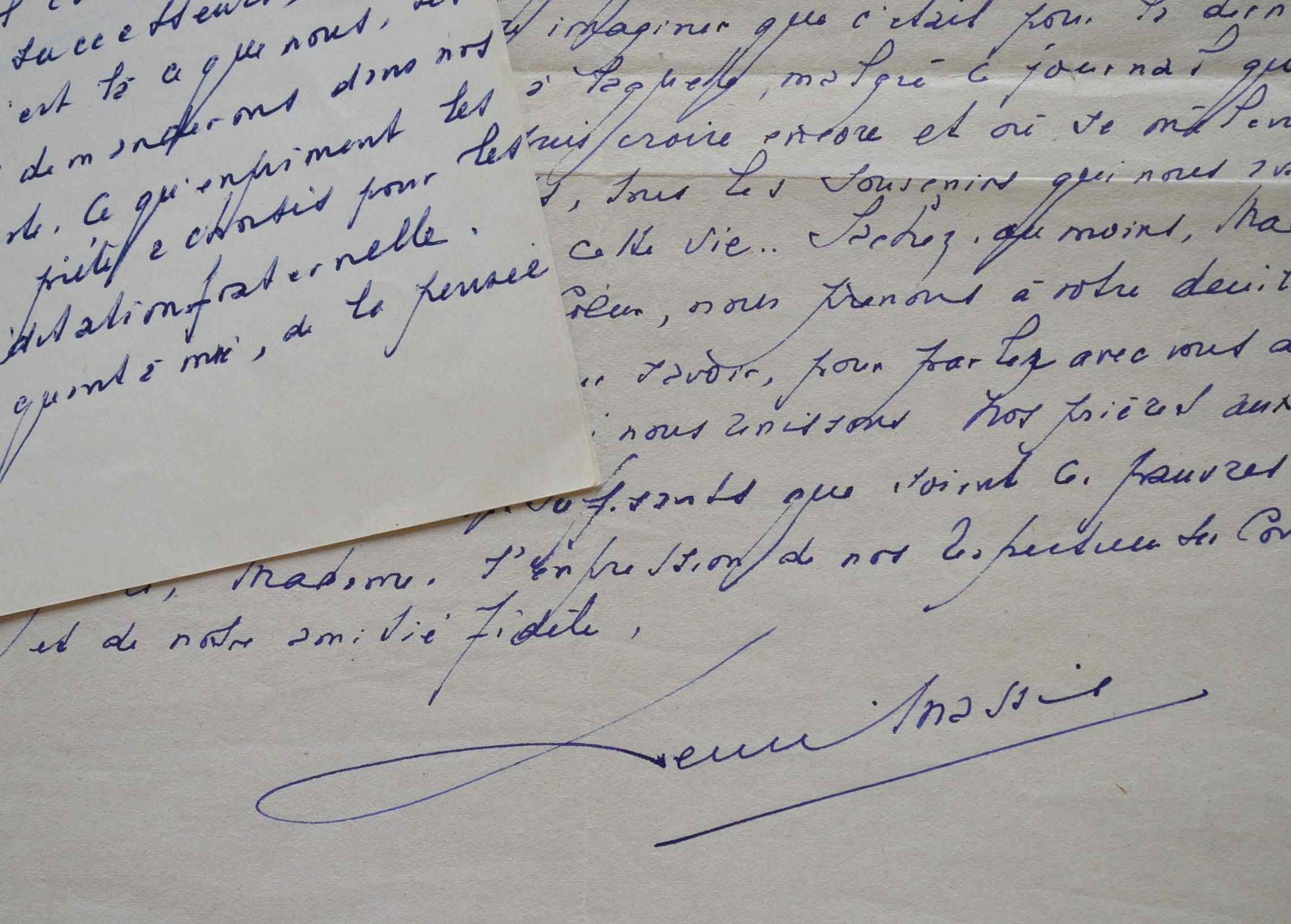 Henri Massis (Paris, 1886/1970)Deux lettres d'Henri Massis relatives au décès et au souvenir de l'amiral Fernet. La première est une lettre de condoléances ; dans la seconde, il évoque son souvenir. "Oui, la vie de Jean Fernet fut pour ceux qui eurent le bonheur d'être de ses amis, un exemple, une lumière, et ceux à qui il fut donné de partager les épreuves ont trouvé auprès d'un tel témoin un réconfort qu'ils ne sont pas près d'oublier. Tous auront encore besoin de lui, car la mort n'interrompt pas le vrai service. Là où il est, il continuera de nous assister, nous et nos successeurs, de nous éclairer la route, et c'est là ce que nous, ses compagnons, nous lui demanderons dans nos prières : c'est, au reste, ce qu'expriment les beaux textes que votre piété a choisis pour les proposer à notre méditation fraternelle [...]".