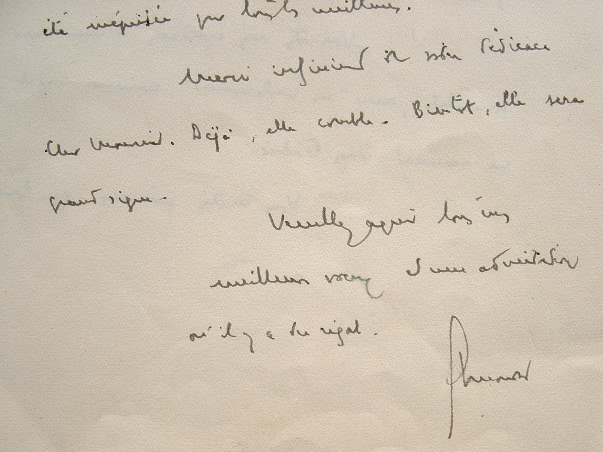En dépit de ses prenantes occupations universitaires, Henri Mondor prend le temps de répondre à son correspondant, au sujet du livre dont il est le dédicataire. «Vous êtes un écrivain d'une rare personnalité ; avec "un instrument", comme on dit, qui ne saurait vous trahir. Vous n'êtes précieux que lorsque vous le décidez et, pour tout, gardez cette maîtrise ; d'où d'extraordinaires raccourcis et des formules chatoyantes [...]. Votre message m'est une exquise forme d'hommage. Je ne doute ni de votre réussite actuelle, ni de ce que vous ferez un jour de plus admirable encore. Votre beau ne risque jamais cette joliesse dont nous conviendrons ensemble un jour, j'espère, qu'elle n'a pas été méprisée par tous les meilleurs. Merci infiniment de votre dédicace, cher monsieur. Déjà, elle comble. Bientôt, elle sera grand signe [...]».
