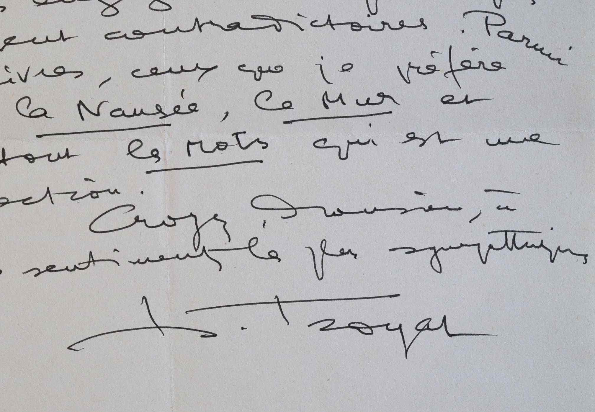 «Vous avez raison : j'admire l'oeuvre de Sartre et suis réticent quant à la valeur de ses engagements politiques, souvent contradictoires. Parmi ses livres ceux que je préfère sont la Nausée, le Mur et surtout les Mots qui est une perfection [...]».