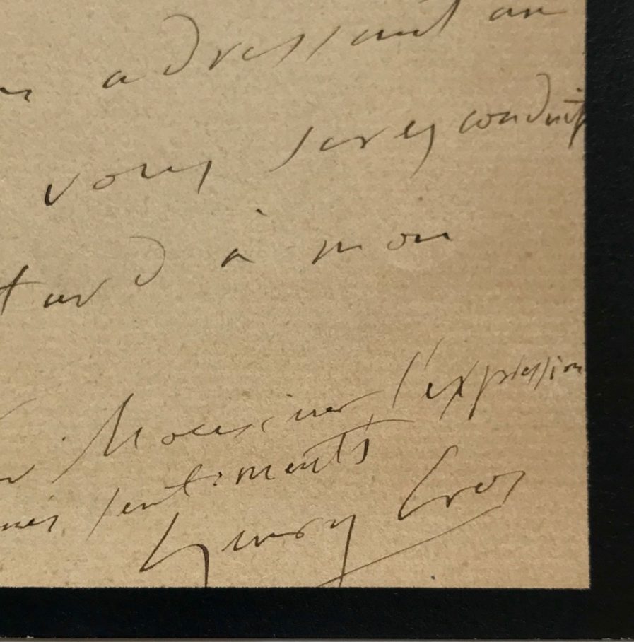 Henry cros sera forcé de se rendre le lendemain à Paris et demande à son correspondant de "fixer à samedi" son "aimable visite". Il ajoute "En vous adressant au Musée vous serez conduit sans retard à mon atelier [...]". Il fait probablement référence à la Manufacture de Sèvres, où il officiait alors.