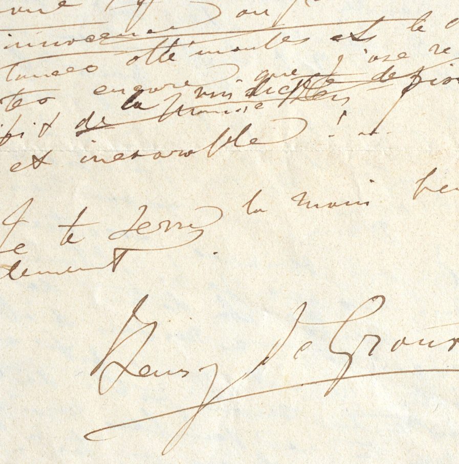 Henry de Groux (Bruxelles, 1866/1930)Intéressante lettre d'Henry de Groux écrite au moment où il s'installe à Paris. Il aurait souhaité inviter son ami mais "je suis pour l'instant à l'hôtel, fort mal installé et en quête d'une définitive installation à Paris. Je me proposais de faire chez Bing une exposition de mes dernières oeuvres, exécutées depuis trois ans que je m'abstiens d'exposer. J'ai reculé la date de cette exposition en raison d'abord du potin récent que fit mon prétendu manifeste antibelge que tu ne sembles vraiment pas avoir sur le coeur, toi!... Dois-je t'en féliciter?... J'ai rencontré hier Georges Eekhoud et Sander Pierron qui m'ont proposé de me ramener en Belgique en femme voilée!... J'ai refusé. Les tableaux que tu as vus chez Bing : la Retraite de Russie, le Retour de l'île d'Elbe et le Cyclone, ne sont pas terminés. Mais j'en ai d'autres qui le sont. L'encombrement chez Bing en ce moment empêche que je te les fasse voir comme je le désirerais. Je serais fort heureux que tu veuilles en parler car c'est devenu le "Dreyfus belge". J'ai au moins autant besoin que lui [...]".