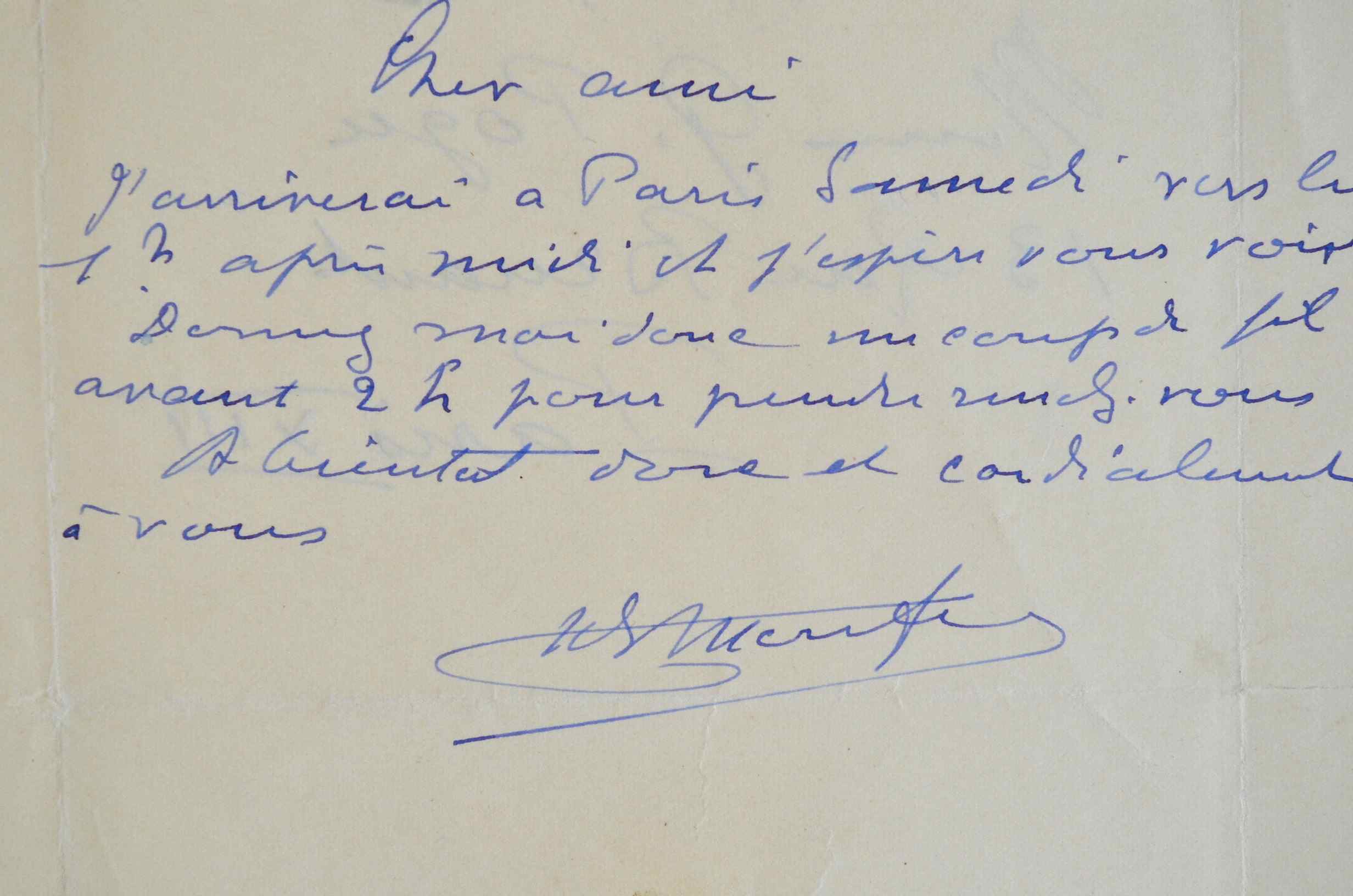 «J'arriverai à Paris samedi vers les 1h après-midi et j'espère vous voir. Donnez moi donc un coup de fil [...]». Adresse au dos. Postée d'Ingrandes (Indre) où il vécu jusqu'à sa mort.