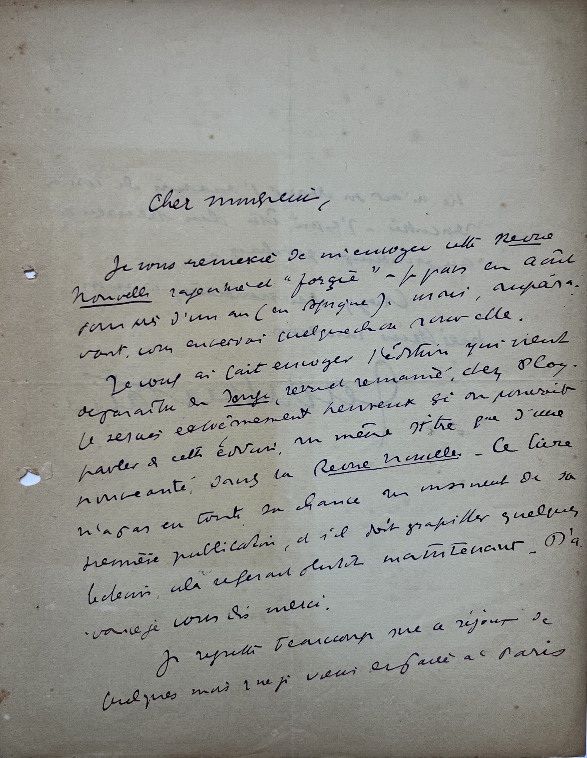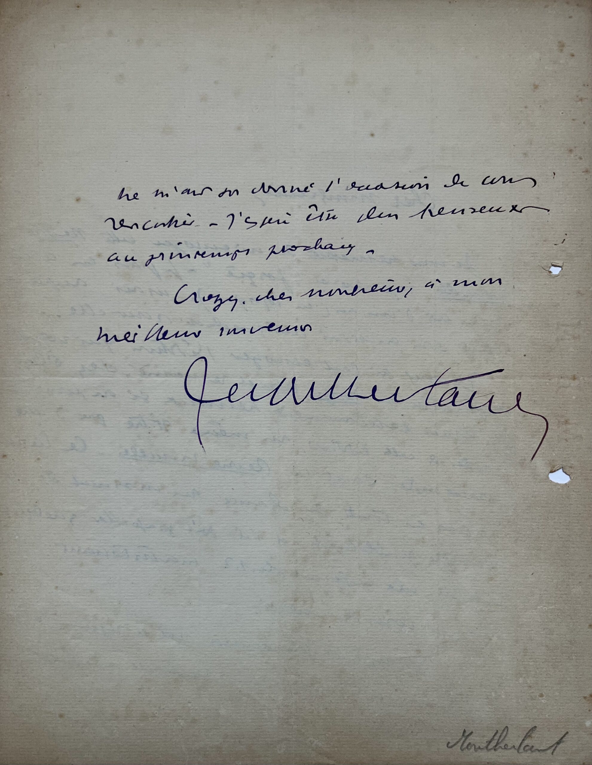 Henry Montherlant (de) (Paris, 1896/1972)"Cher Monsieur, je vous remercie de m’envoyer cette Revue Nouvelle rajeunit et "forçie". Je pars en août pour près d’un an (en Afrique) [il ira surtout en Algérie]. Mais, auparavant, vous enverrai quelque chose pour elle. Je vous ai fait envoyer l'édition qui vient de paraître du Songe, revu et remanié, chez Plon [1930]. Je serais extrêmement heureux si on pouvait parler de cette édition, au même titre que d’une nouveauté dans la Revue Nouvelle. Ce livre n’a pas eu toute sa chance au moment de sa première publication [...]". Il regrette de ne pas avoir le rencontrer lors de son séjour parisien qui s'achève.