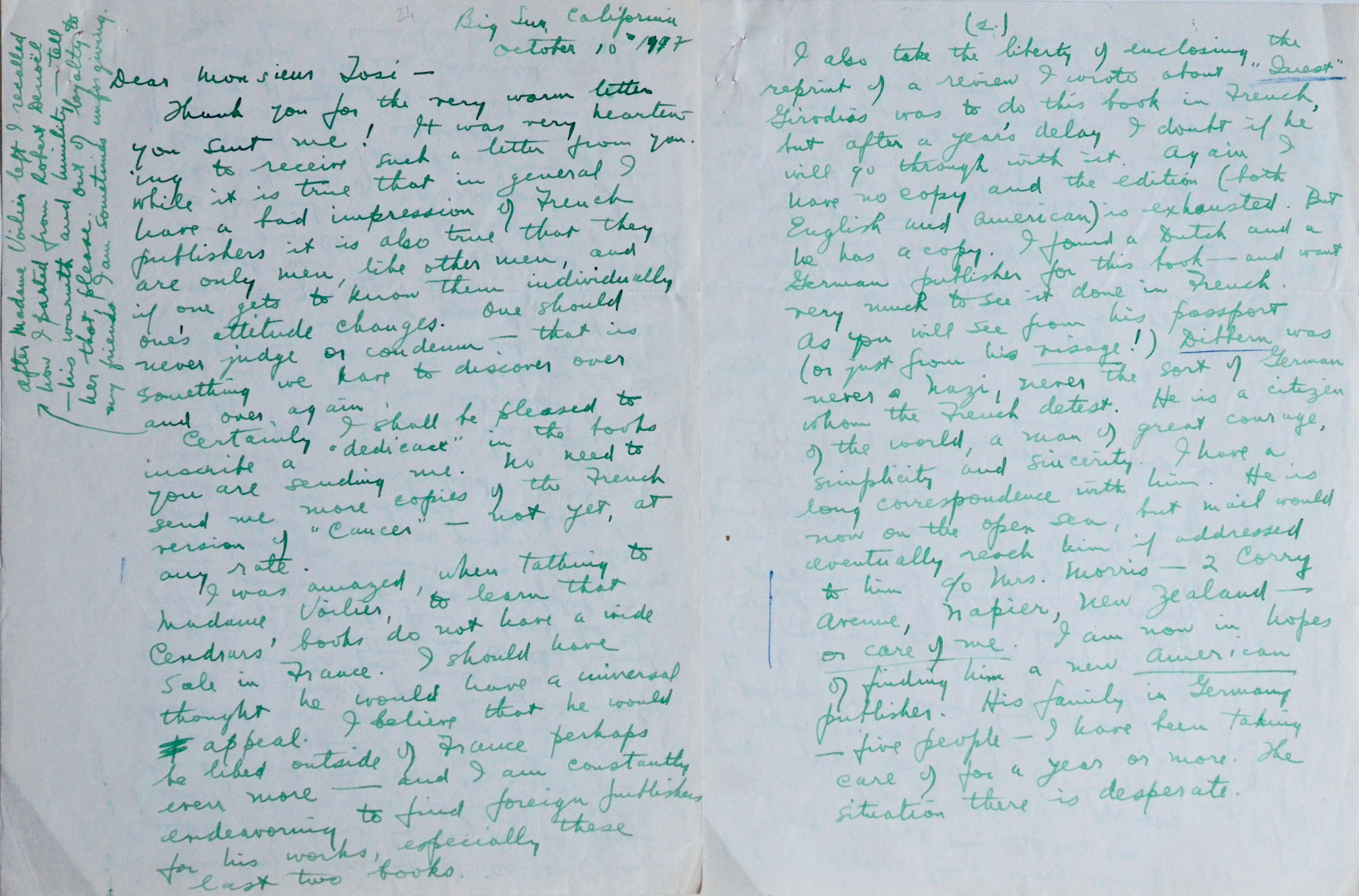 Il remercie Guy Tosi, directeur littéraire des éditions Denoël, de sa lettre encourageante car il a une mauvaise impression des éditeurs français. Il évoque les éditeurs Jean Voilier et Robert Denoël, demande plus d'exemplaires de la traduction française de son ouvrage le plus célèbre "Tropique du Cancer" et serait ravi de lui dédicacer les livres qu'il lui enverra.