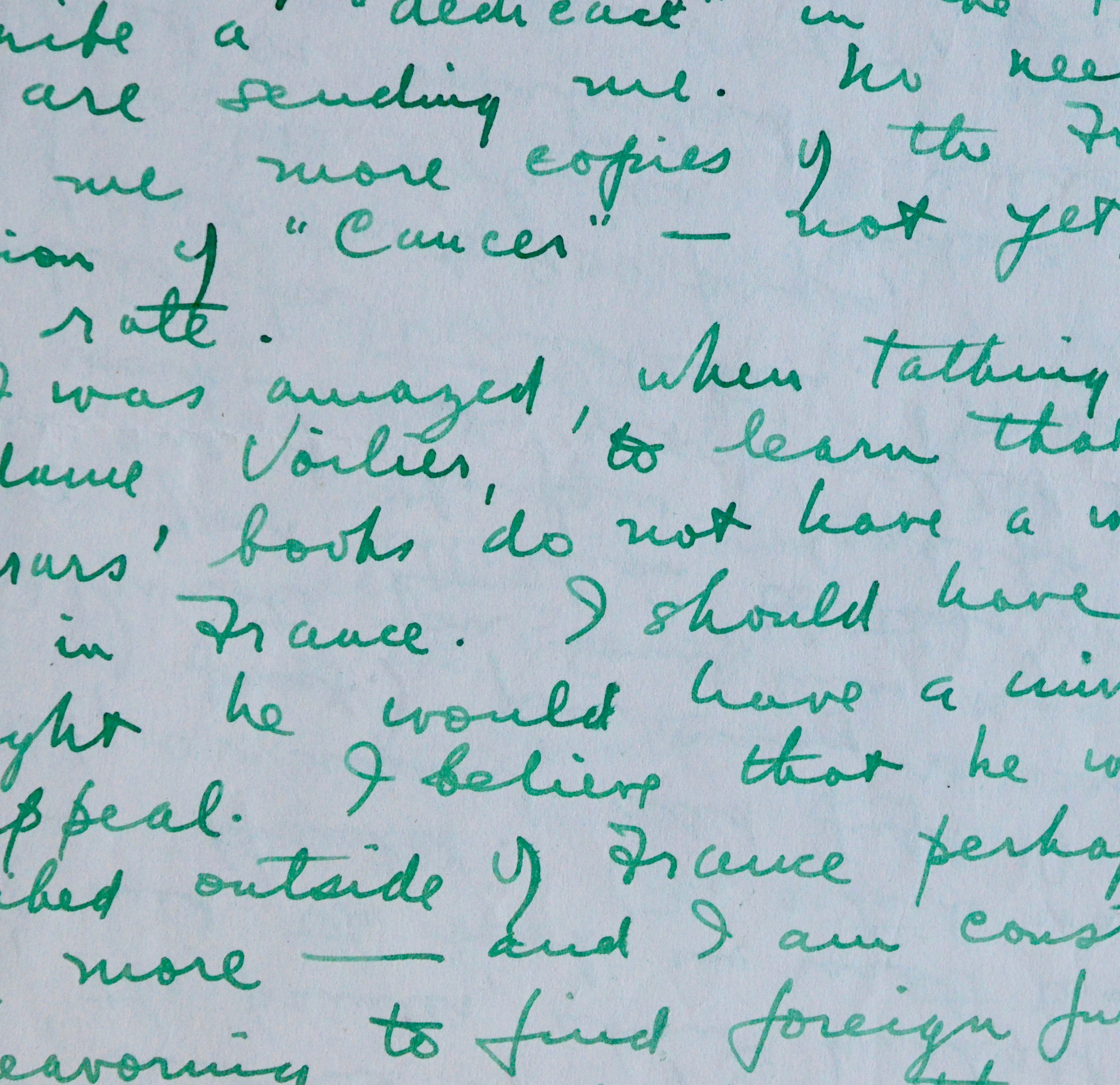 Il a été étonné d'apprendre par Jean Voilier que les livres de Cendrars ne se vendaient pas très bien en France. Il pensait qu'il avait un attrait international, il s'efforce de lui trouver des éditeurs étrangers surtout pour ses deux derniers ouvrages. Il a reçu une coupure de " Combat " par son ami le peintre Hans Reichel au sujet de Michael Fraenkel et du livre "Hamlet" qu'ils ont écrit ensemble et qui n'a pas été accepté par Maurice Girodias, il peut essayer auprès de Denoël. Il fait l'éloge de son ami, le navigateur [George] Dibbern "He is a citizen of the world, a man of great courage, simplicité and sincérité. I have a long correspondance with him [...]", actuellement en mer, il donne l'adresse en Nouvelle Zélande, à laquelle il sera le plus susceptible de lui faire parvenir un courrier. Miller essaye de lui trouver un éditeur. Il évoque la situation dramatique de l'Allemagne " the poorest of us is rich by comparaison with the millions of desperate souls throughout the civilized world I share with those less fortunate [...]"