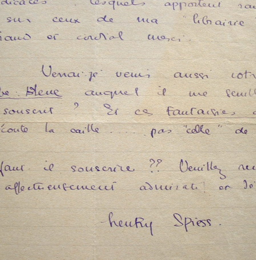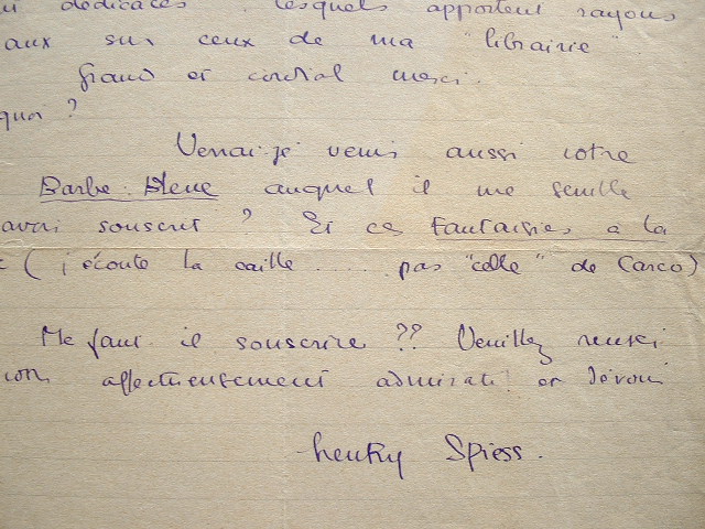 «Voici bien ces Enchanteurs [de Paul Fort, l'un des textes des "Ballades françaises" paru en 1919], si affectueusement dédicacé, lesquels apportent rayons nouveaux sur ceux de ma "librairie". Grand et cordial merci». Il demande des nouvelles de l'écriture de Barbe-Bleue, auquel il a souscrit. «Et ces Fantaisies à la gauloise (j'écoute la caille... pas "celle" de Carco). Me faut-il souscrire?» [Barbe-Bleue, le XXIVe volet des "Ballades Française", paraîtra quelques mois plus tard].