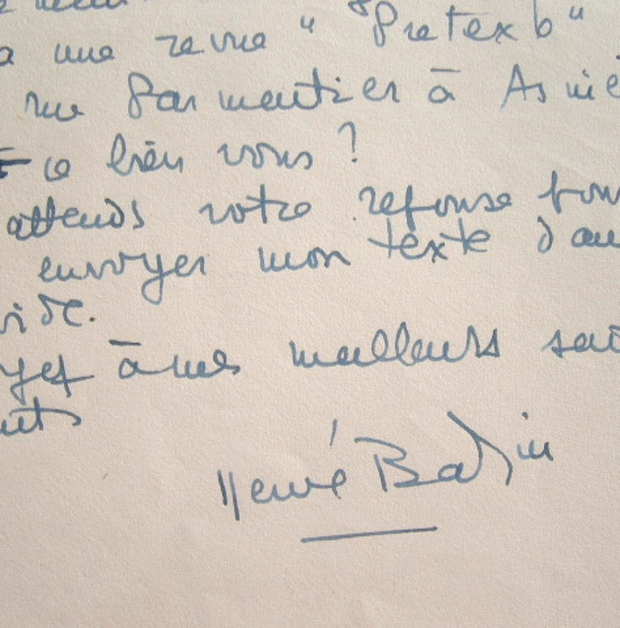 «Vous aurez décidément de la malchance. Sur votre demande, j'ai finalement écrit une réponse de 4 pages (dactylo), mais j'étais si persuadé d'avoir votre adresse que je ne l'ai pas notée. Les renseignements me signalent qu'il y a une revue "Prétexte" 31 rue Parmentier à Asnières. Est-ce bien vous? J'attends votre réponse pour ne pas envoyer mon texte dans le vide [...]».
