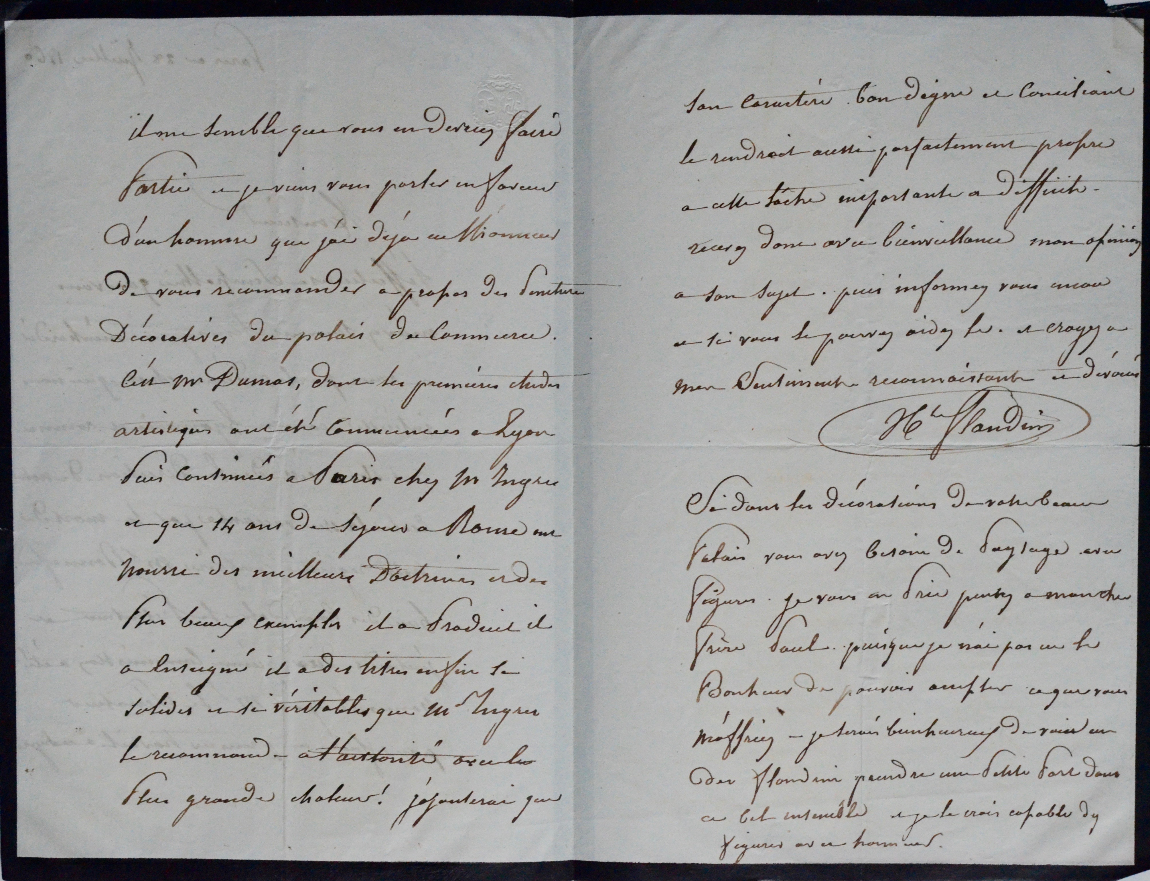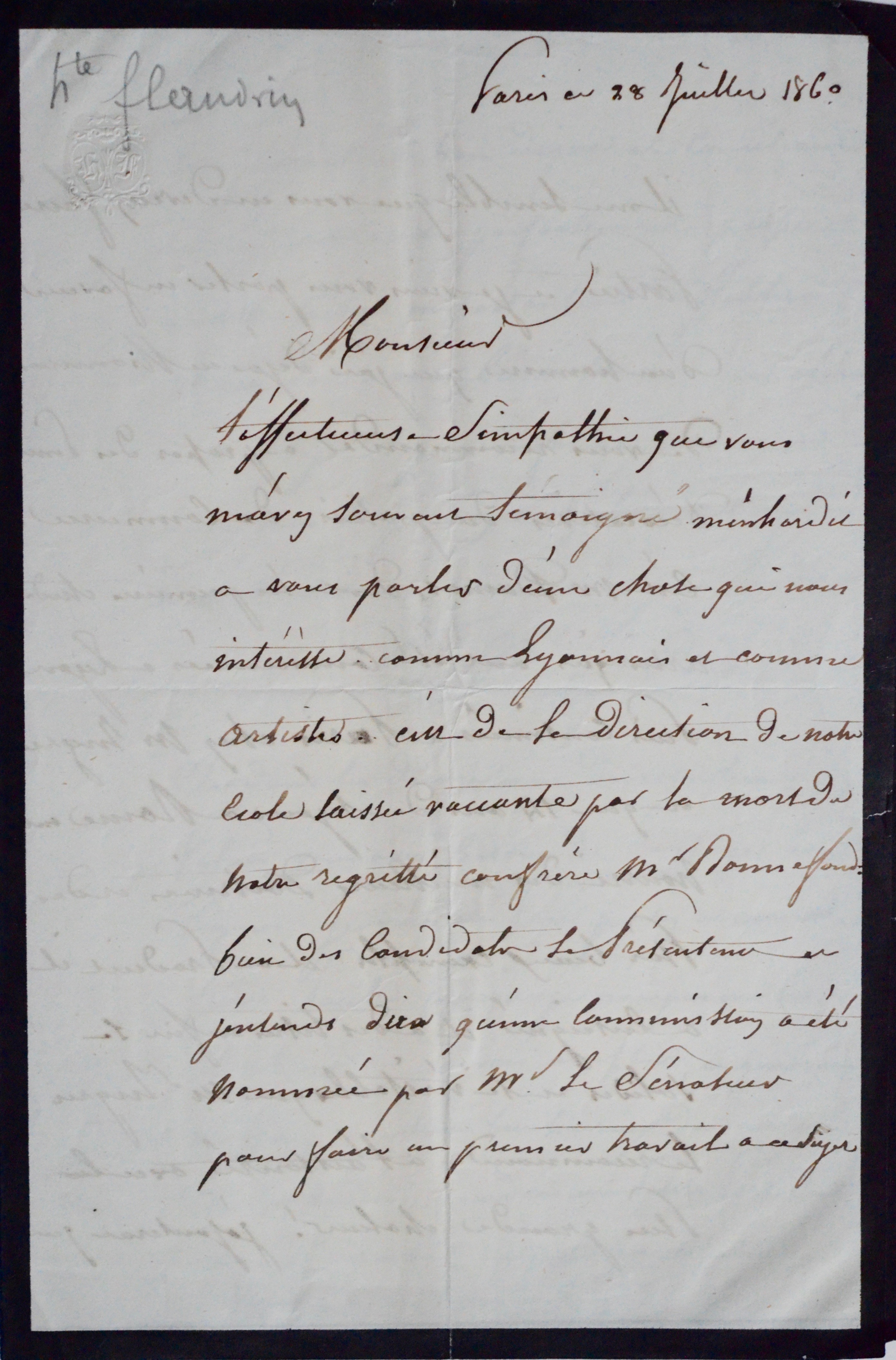 Hippolyte Flandrin (Lyon, 1809/1864)Il recommande vivement le peintre Michel Dumas (1812-1885), suivant l'avis d'Ingres, pour la succession de Bonnefond à la direction de l'École des Beaux-Arts de Lyon.