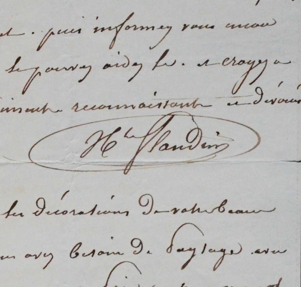 Il ajoute en post-scriptum une seconde recommandation, pour son frère cadet, Paul Flandrin (1811-1902) : "Si dans les décorations de votre beau palais vous avez besoin de paysage avec figure, je vous en prie pensez à mon cher frère Paul [...] je serais bien heureux de voir un des Flandrin prendre une petite part dans ce bel ensemble et je le crois capable d'y figurer avec honneur".