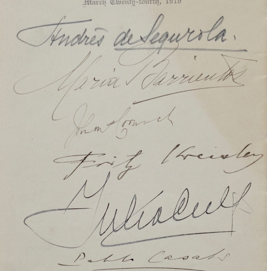 Le 24 mars 1916, revenant d'une tournée triomphale aux Etats-Unis pour la création de son opéra Goyescas, Enrique Granados décède en pleine mer avec son épouse, après le torpillage du navire qui le ramenait en Europe par un sous-marin allemand. Un concert de charité est organisé au Metropolitan Opera de New York, au bénéfice de ses enfants. Le programme de ce concert est signé au dos par les 7 compositeurs, chanteurs et musiciens qui y ont participé : le basse espagnol Andrés de Segurola (1874/1953), la soprano espagnole Maria Barrientos (1883/1946), le ténor irlandais John McCormack (1884/1945), le violoniste et compositeur autrichien Fritz Kreisler (1875/1962), la mezzo-soprano hollandaise Julia Culp (1880/1970), le violoncelliste et compositeur espagnol Pablo Casals (1876/1973) et le compositeur et pianiste polonais Ignacy Jan Paderewski (1860/1941).