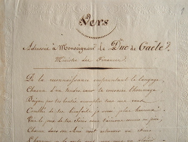 Hommage poétique signé Louette (P.-A. Louette, officier en retraite, auteur de couplets et stances pour la naissance du duc de Bordeaux). «[...] Ma Muse est toujours prête à chanter ta mémoire. Mon coeur sera pour toi le temple de l'histoire. Ton nom sera chéri des heureux que tu fais. Tu seras immortel ainsi que tes bienfaits. O' Protecteur des Arts, Ami de la jeunesse [...]». Intitulé : "Vers adressés à monseigneur le duc de Gaëte, ministre des Finances".