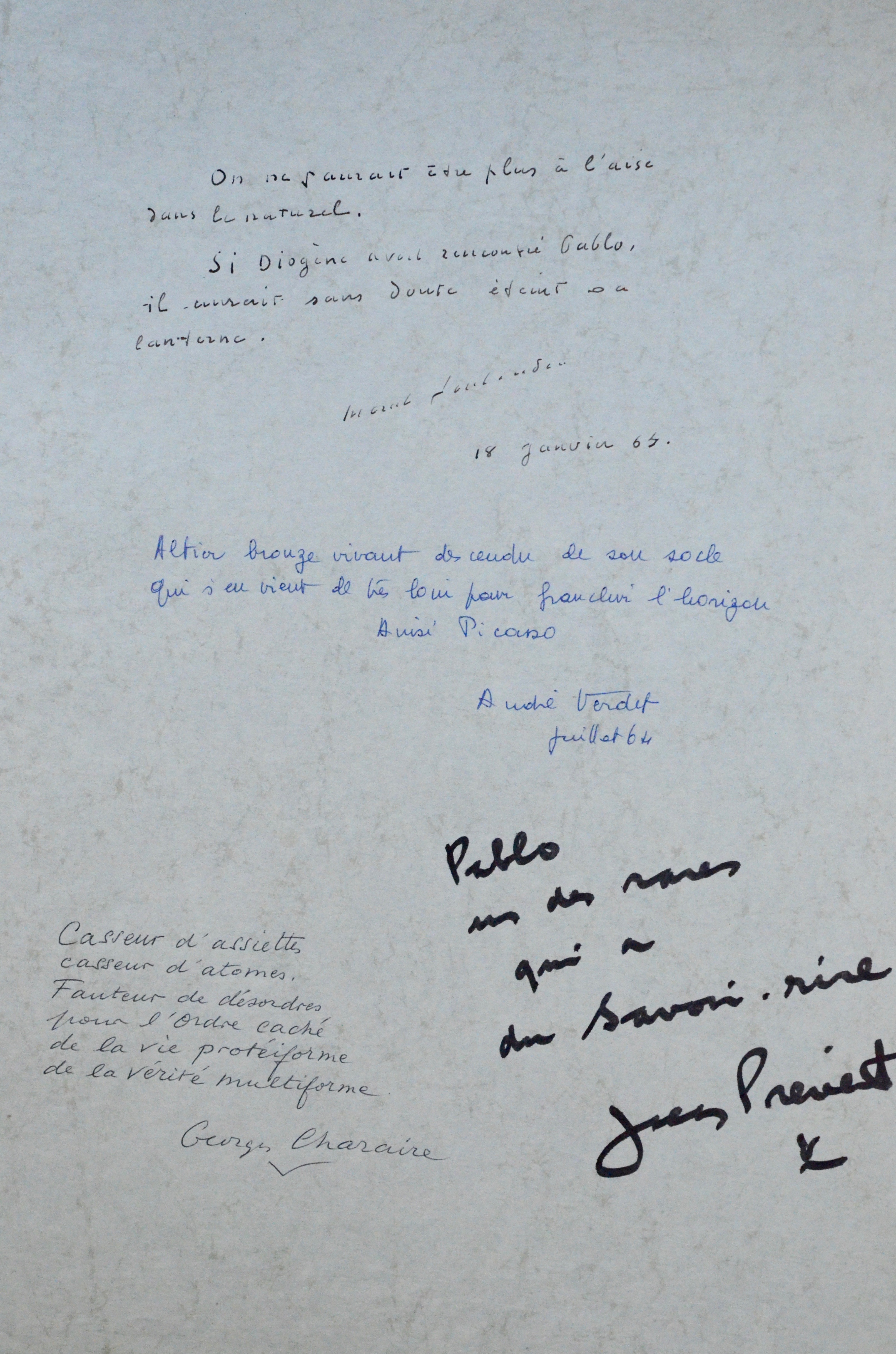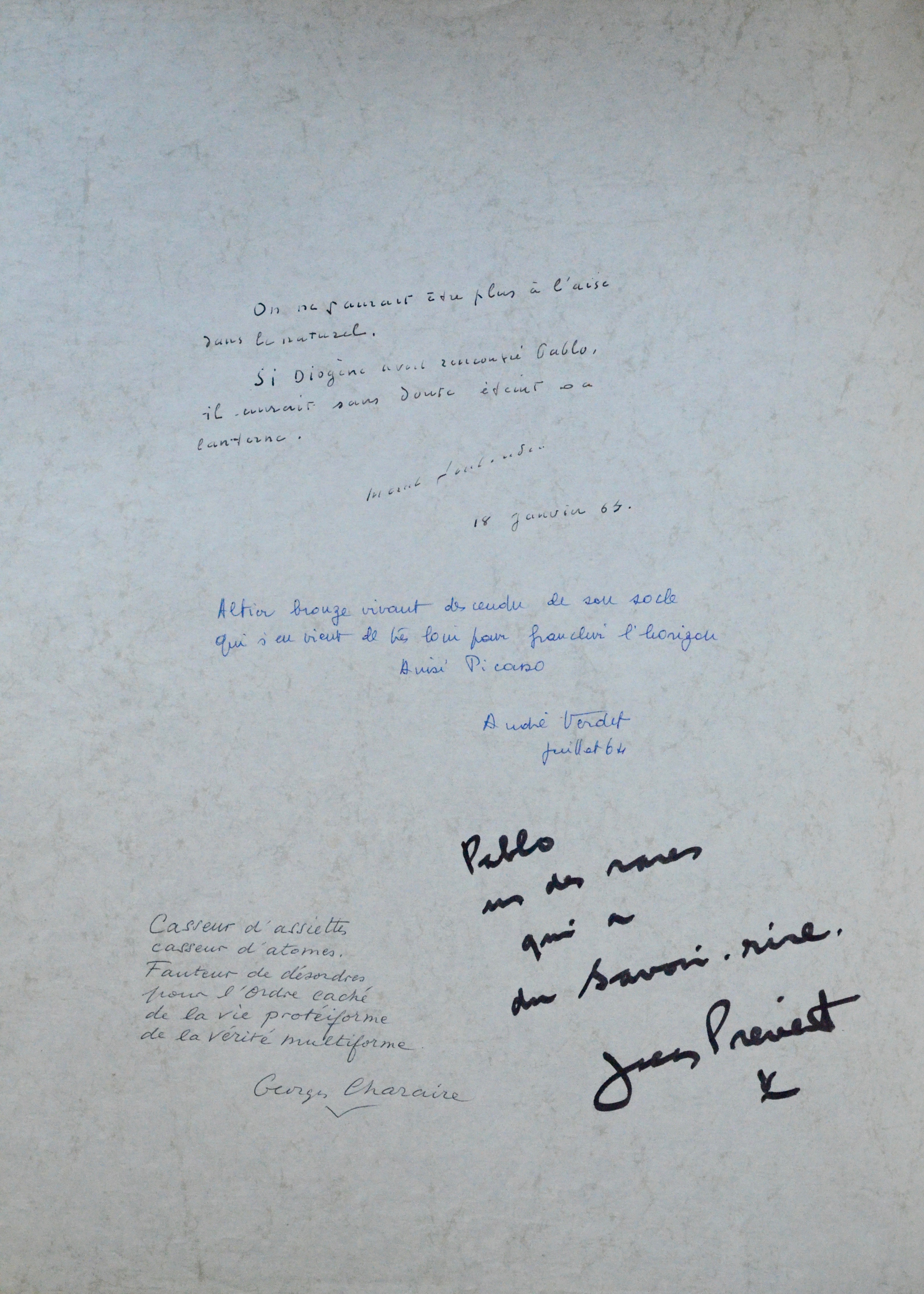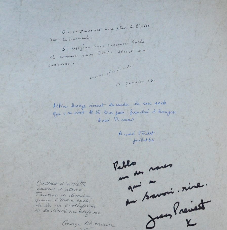 Jacques Prévert (Neuilly-sur-Seine, 1900/1977)Grand feuillet portant les textes de Marcel Jouhandeau, d'André Verdet, de Georges Charaire et de Jacques Prévert, à propos de Pablo Picasso :
