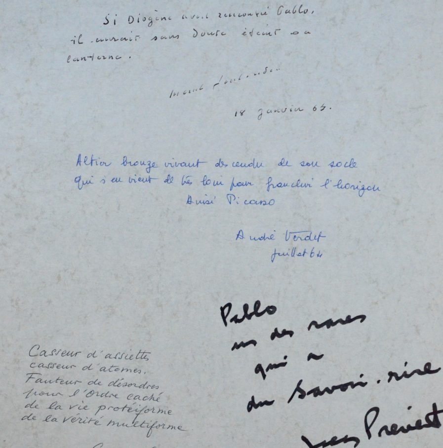 André Verdet : "Altier bronze vivant descendu de son socle qui s'en vient de très loin pour franchir l'horizon. Ainsi Picasso". Juillet 1964.
