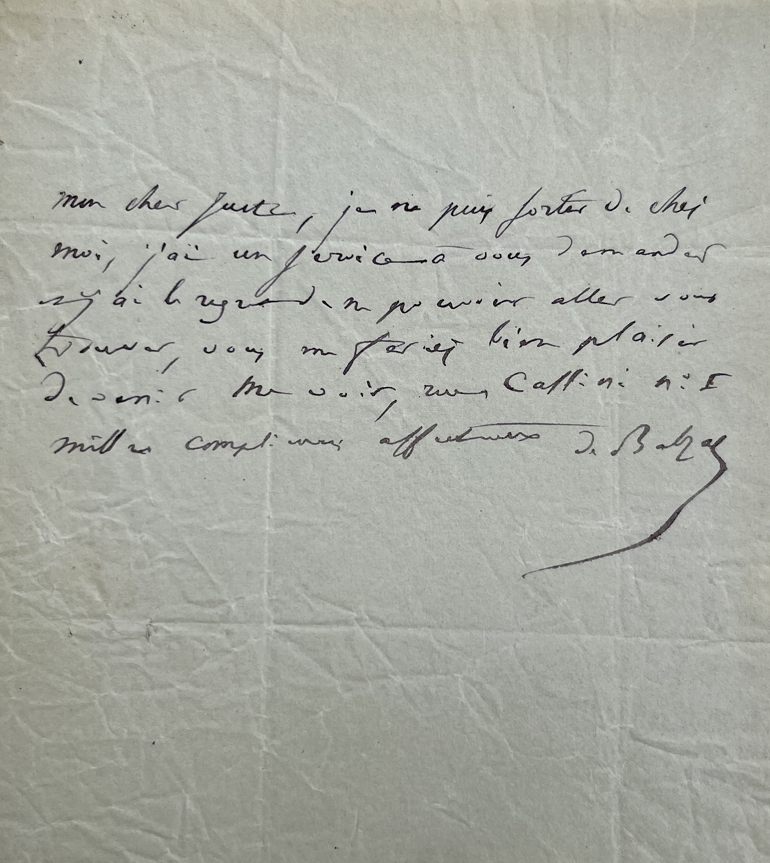 "Mon cher Just, je ne puis sortir de chez moi, j'ai un service à vous demander et j'ai regret de ne pouvoir aller vous trouver, vous me feriez bien plaisir de venir me voir, rue Cassini n° 1. Mille compliments affectueux. de Balzac".
