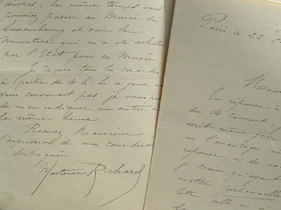 Hortense Richard répond au souhait de son correspondant qui, d'après la recommandation du président de la Société des amis des arts, Tillier, désire prendre connaissance de son travail. «Toutes les miniatures dont je dispose sont enfermées dans une grande vitrine difficile à déplacer. Il serait préférable que vous preniez la peine de venir à mon atelier, 162 Bd du Montparnasse. Vous pourriez mieux ainsi juger de l'ensemble de mes oeuvres. En même temps vous pourriez passer au musée du Luxembourg et voir la miniature qui m'a été achetée par l'Etat pour ce musée [...]».