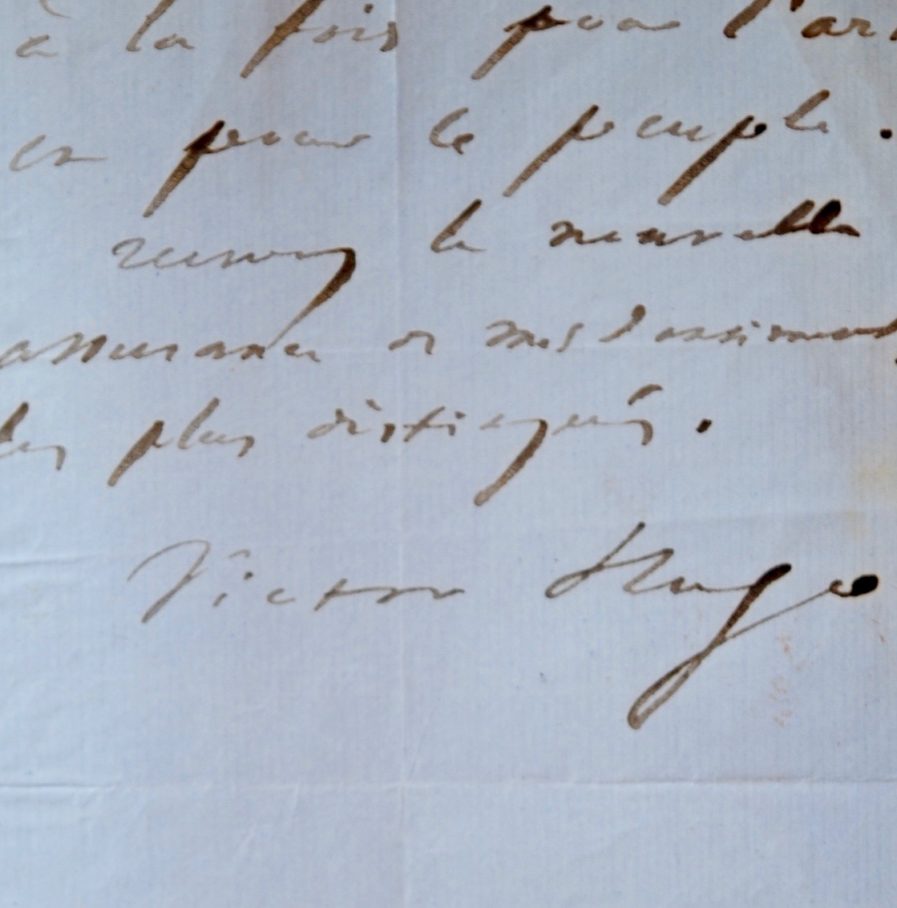 Victor Hugo (Besançon, 1802/1885)Lettre de Victor Hugo, adressée à la fin de son exil, à Raphaël Félix (1825-1872), alors directeur du théâtre de la Porte Saint-Martin. Hugo répond à sa demande de reprise de ses pièces de théâtre : « Monsieur, j'ai reçu la lettre que vous m'avez fait l'honneur de m'écrire au sujet de la reprise de mon répertoire. Le désir que vous m'exprimez en termes si honorables me touche ; j’examinerai vos propositions, et je serai heureux s’il m’est possible d’y accéder ; vous savez combien je prise votre intelligente direction et combien j’aime votre beau et grand théâtre, fait à la fois pour l’art et pour le peuple [...] ».