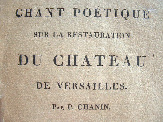 "Chant poétique sur la restauration du château de Versailles" par P. Chanin. Poème à la gloire de Versailles, son château, son parc, ses sculptures et ses deux trianons. Rare brochure absente des collections de la B.N.F.
