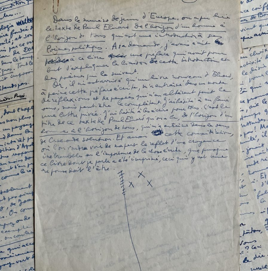 Louis Aragon (Paris, 1897/1982)Brouillon d'un long article critique d'Aragon pour la revue littéraire Europe, (fondée en 1923 par Romain Rolland), rédigé après de la publication de Voir, anthologie de la peinture contemporaine illustrée de poèmes d'Éluard, alors même qu'il rédigeait la préface aux Poèmes politiques d'Éluard.