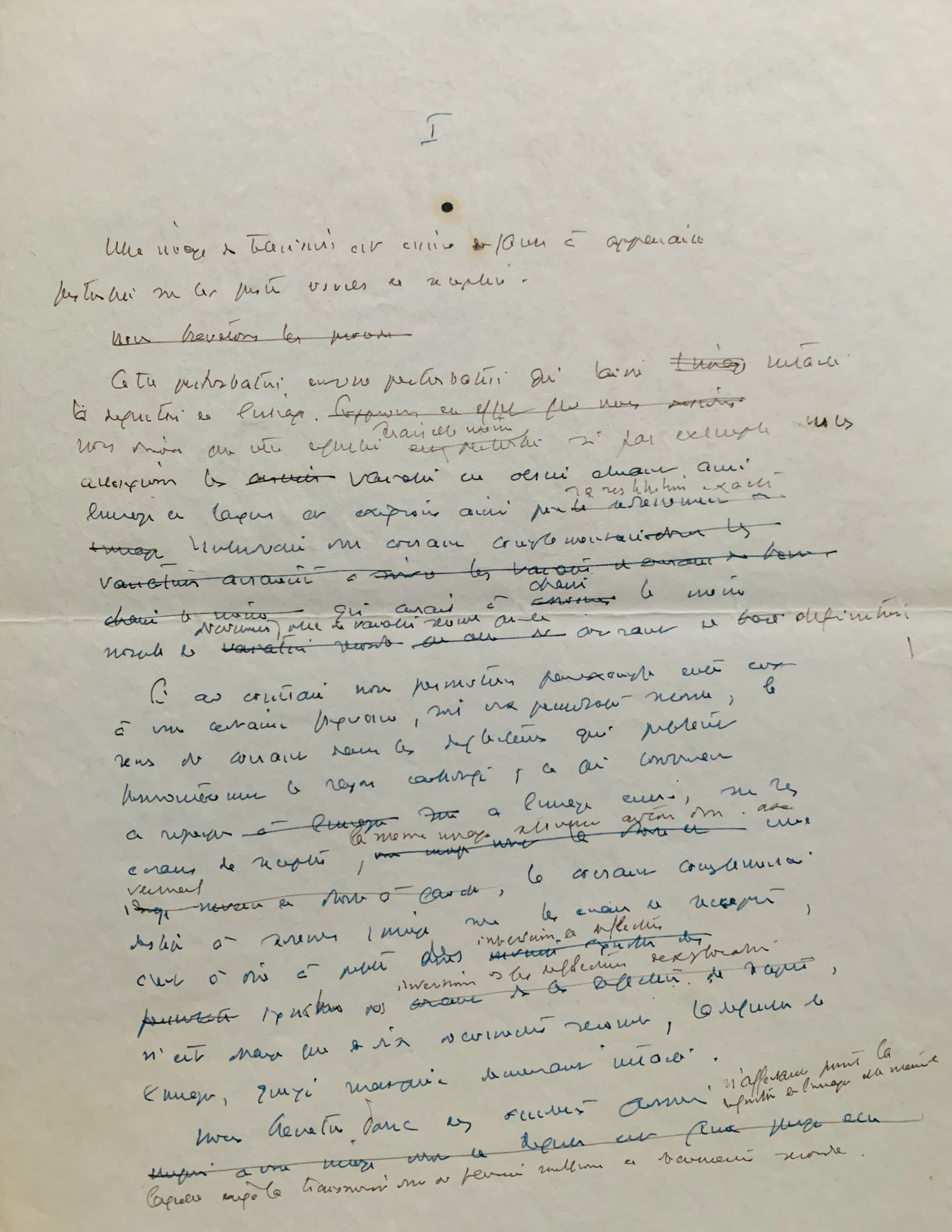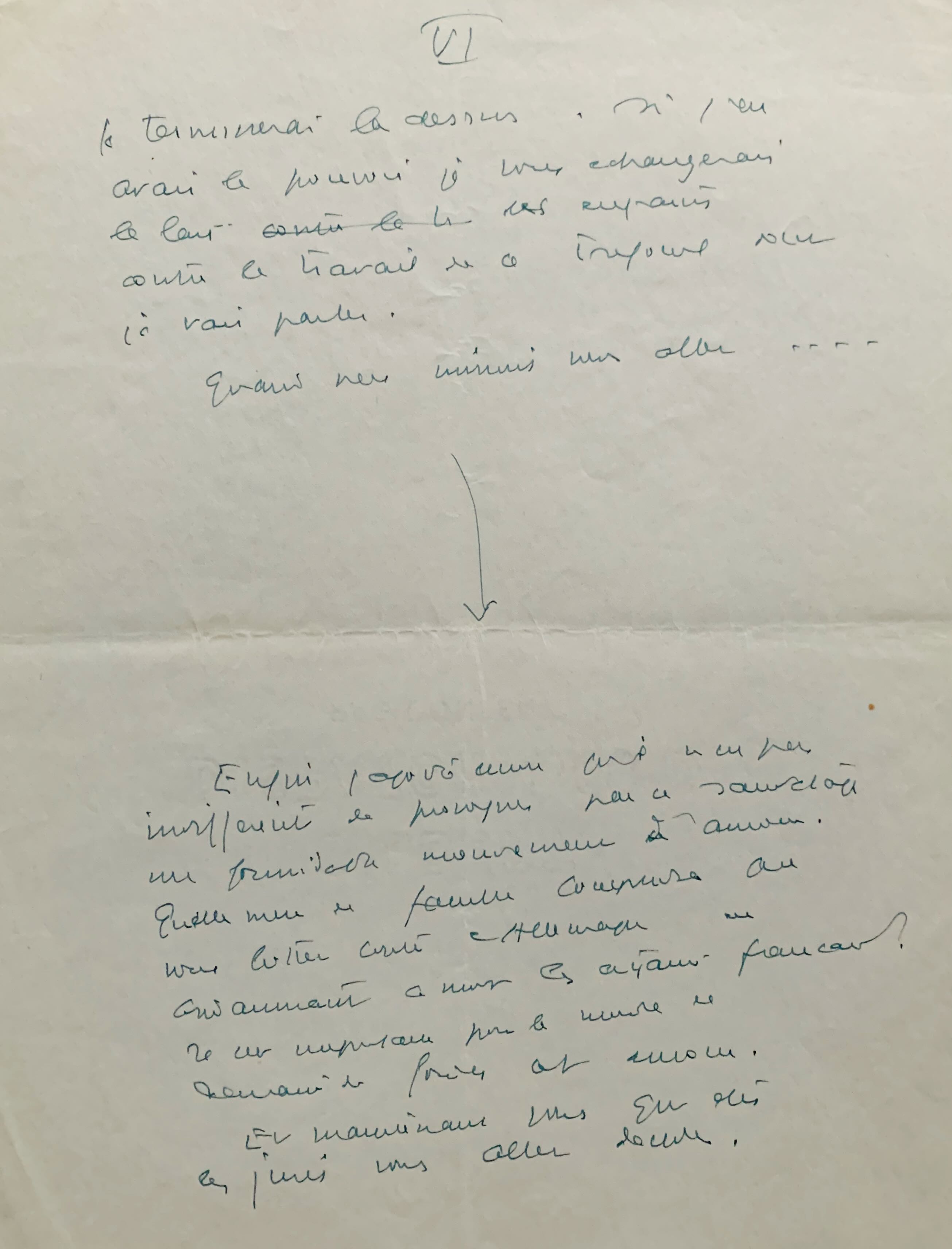 Brouillon divisé en six chapitres, le premier très difficile à lire, traitant d'un procédé de transmission (probablement sans rapport), avec au dos, des essais de plume et les premiers mots d’une lettre. Au verso du 3e feuillet, brouillon d'un autre texte.