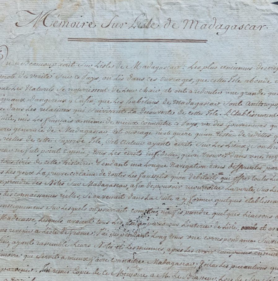 Très important et rare «Mémoire sur l'isle de Madagascar» destiné à «messieurs les députés de l'Isle de France à la Convention nationale», qui est un rapport d'exploration de l'île devant servir de base à l'établissement de comptoirs français, basé sur une absolue interdiction de la traite.