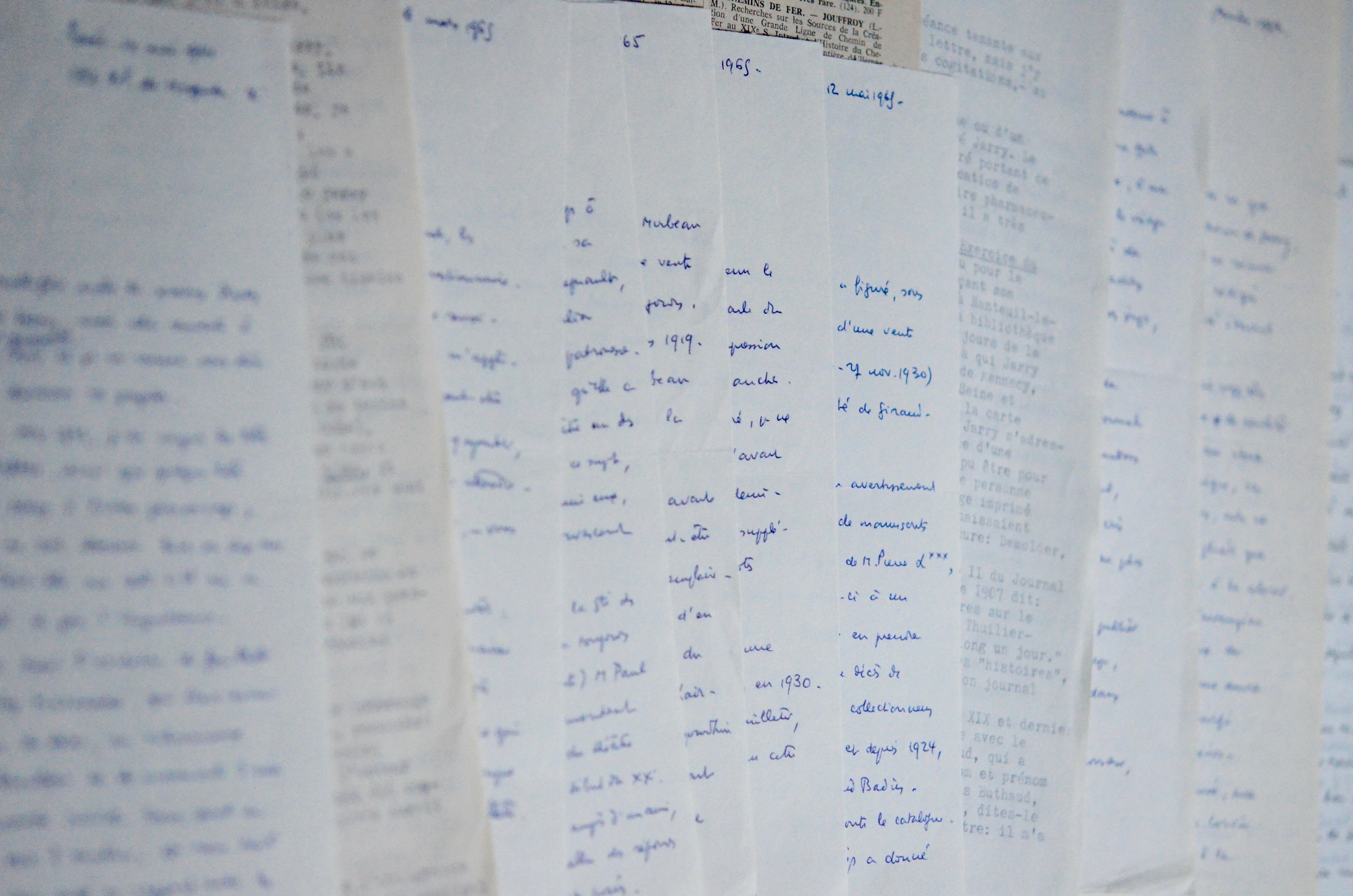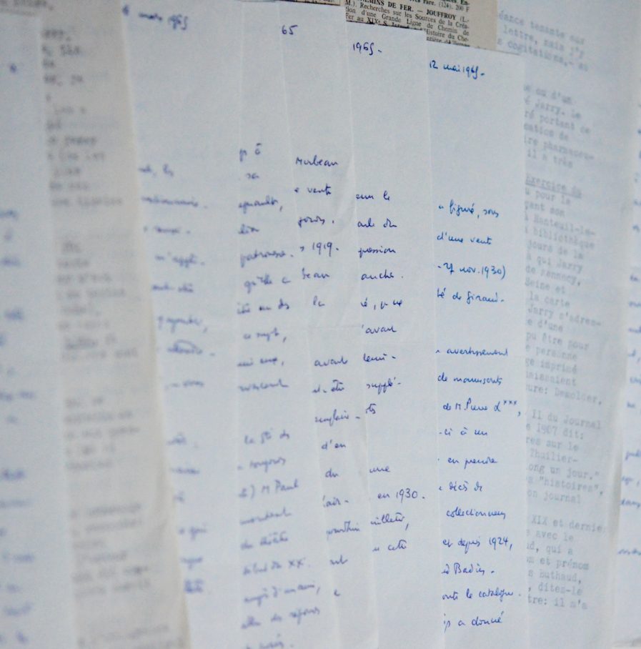 Extraits : "Je ne dois plus posséder qu'un billet ou deux de Jarry. Je les rechercherai et vous en communiquerai le texte. Ils ont peu d'importance. J'ai eu autrefois les lettres de Jarry à Saltas, qu'un collectionneur avait fait relier. Je les avais communiquées à Latis, ou plutôt à Sainmont, qui en certainement pris alors une copie fidèle et les a peut-être même photographiées. Je lui avais communiqué également une lettre de Jarry à Fénéon, dans laquelle Jarry parlait de Saltas en termes aigres-doux. Les Cahiers (ou les Dossiers) du collège de Pataphysique ont reproduit plus tard le texte de cette lettre. Il ne me reste rien de ces correspondances-là, dont j'ai dû me défaire il y a une dizaine d'années dans une période de dèche [...]. Les difficultés d'établissement du texte doivent être considérables. Tout ce qu'a laissé Jarry n'est pas encore connu. Le Mercure annonce la publication de textes de jeunesse (ce doit être Saillet qui s'occupe de cela). Matarasso, il y a une douzaine d'années, détenait un assez important manuscrit de Jarry : les brouillons d'une Léda, si mes souvenirs sont exacts. J'ignore ce que ces brouillons sont devenus [...]".