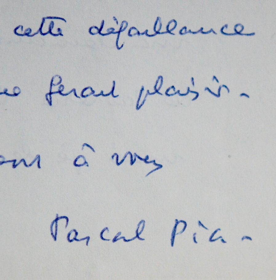 "Je suis assez délabré et ne me sens pas la force de procéder à des recherches". Il souhaite à Arrivé de "réussir le rassemblement de tous les textes de Jarry (j'en serais, quant à moi, absolument incapable) [...]". Plus tard, Pia félicite son correspondant pour la première partie de son travail et attend la suite de la publication. En 1972, Pia évoque l'ouvrage Les langages de Jarry : essai de sémiotique littéraire d'Arrivé, fraîchement paru.