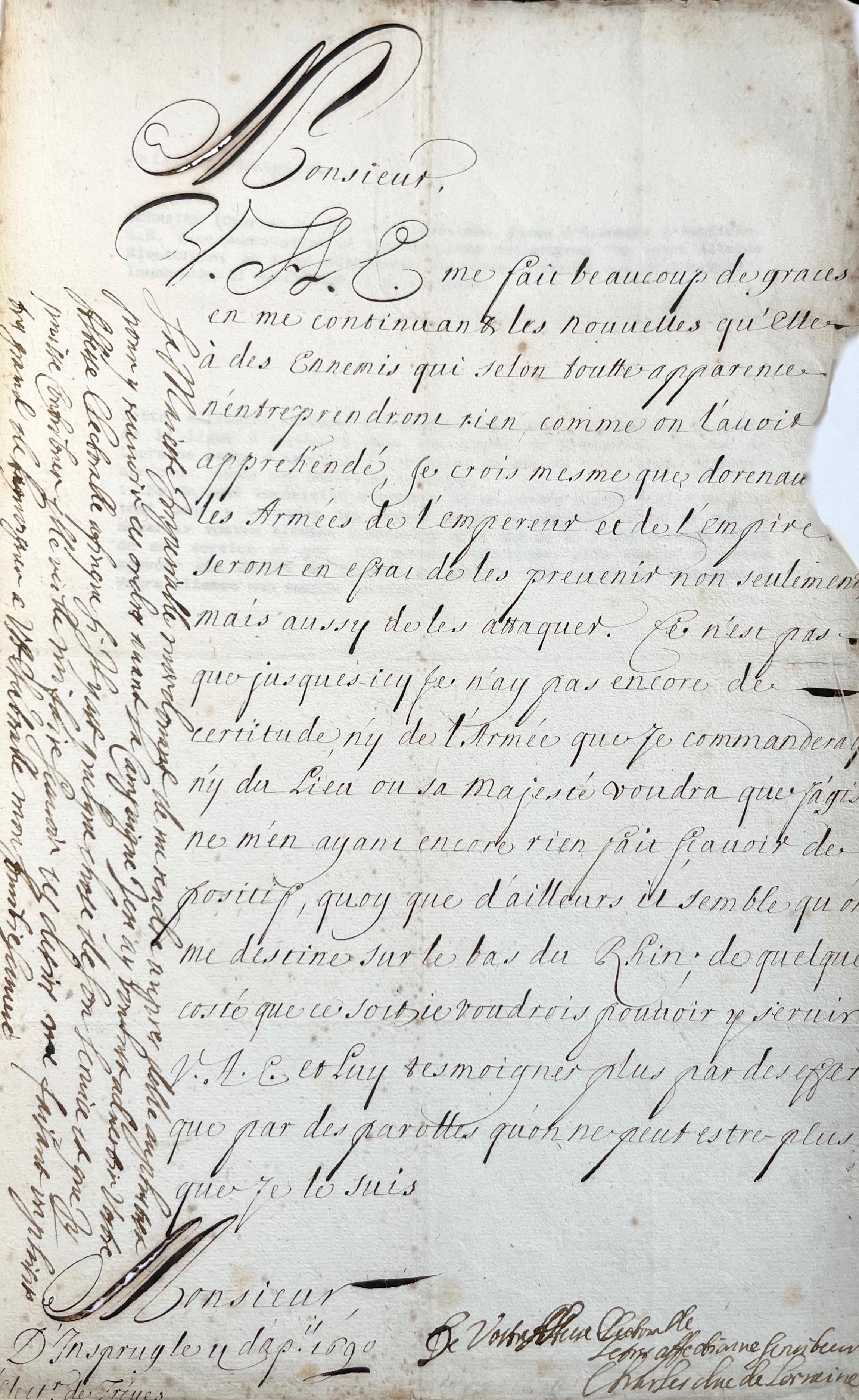 Charles V de Lorraine (Vienne, 1643/1690)Importante lettre avec souscription et postscriptum de cinq lignes autographes de Charles V duc de Lorraine, écrite 7 jours avant sa mort, durant la guerre de la Ligue d'Augsbourg.