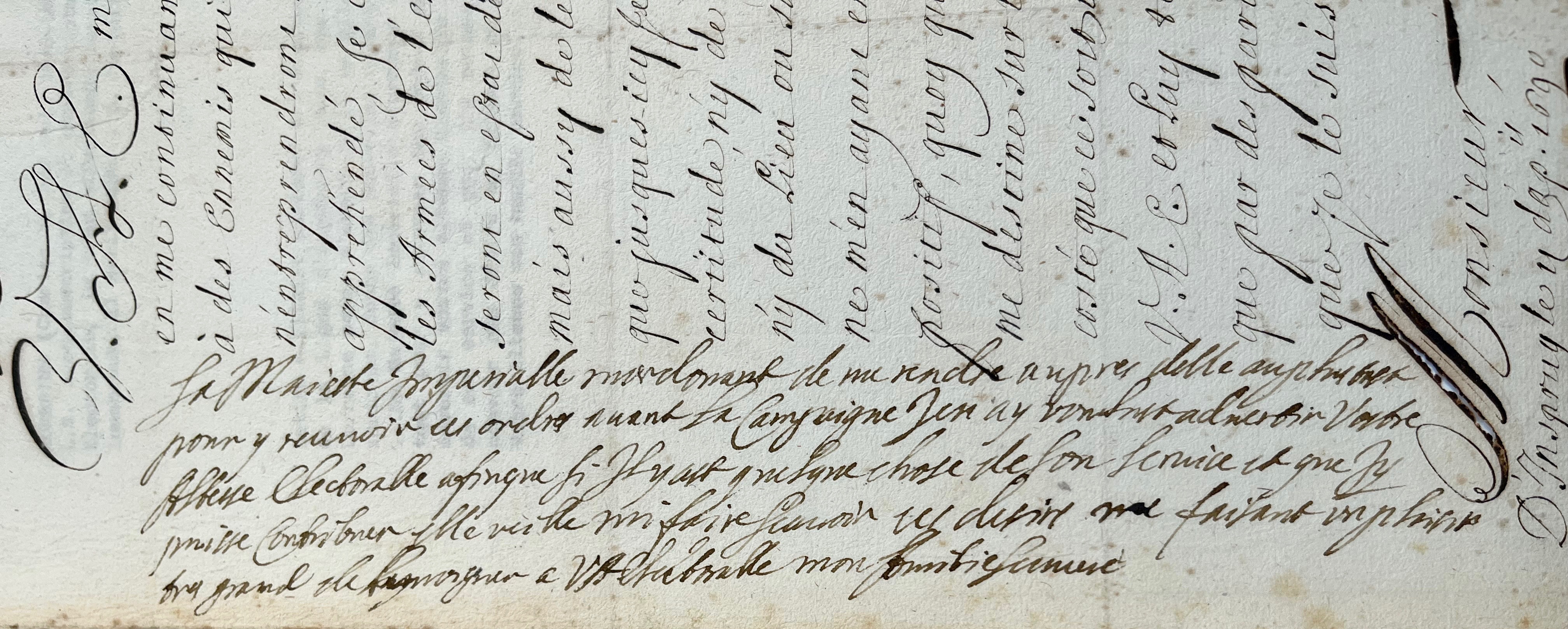 "V. A. E. [Votre Altesse Electorale] me fait beaucoup de grâces en me continuant les nouvelles qu'elle a des ennemis qui selon toutte apparence n'entreprendront rien, comme on l'avoit appréhendé. Je crois mesme que dorévanavant les armées de l'Empereur et de l'empire seront en estat de les prevenir non seulement mais aussy de les attaquer. Ce n'est pas que jusques icy je n'ay pas encore de certitude ny de l'Armée que je commanderay ny du lieu où Sa Majesté voudra que j'agisse, ne m'en ayant encore rien fait sçavoir de positif, quoy que d'ailleurs il semble qu'on me destine sur le bas du Rhin […]".