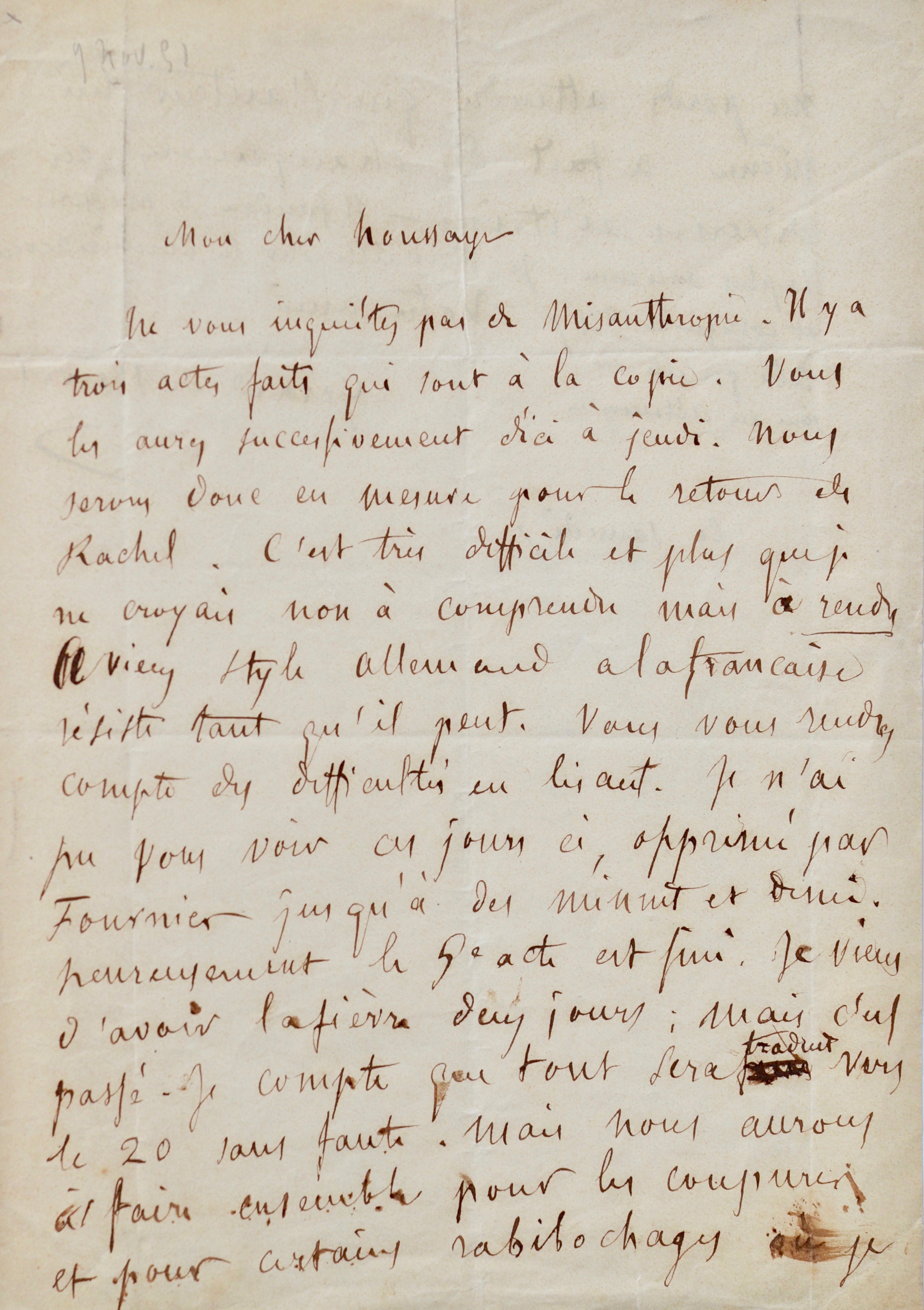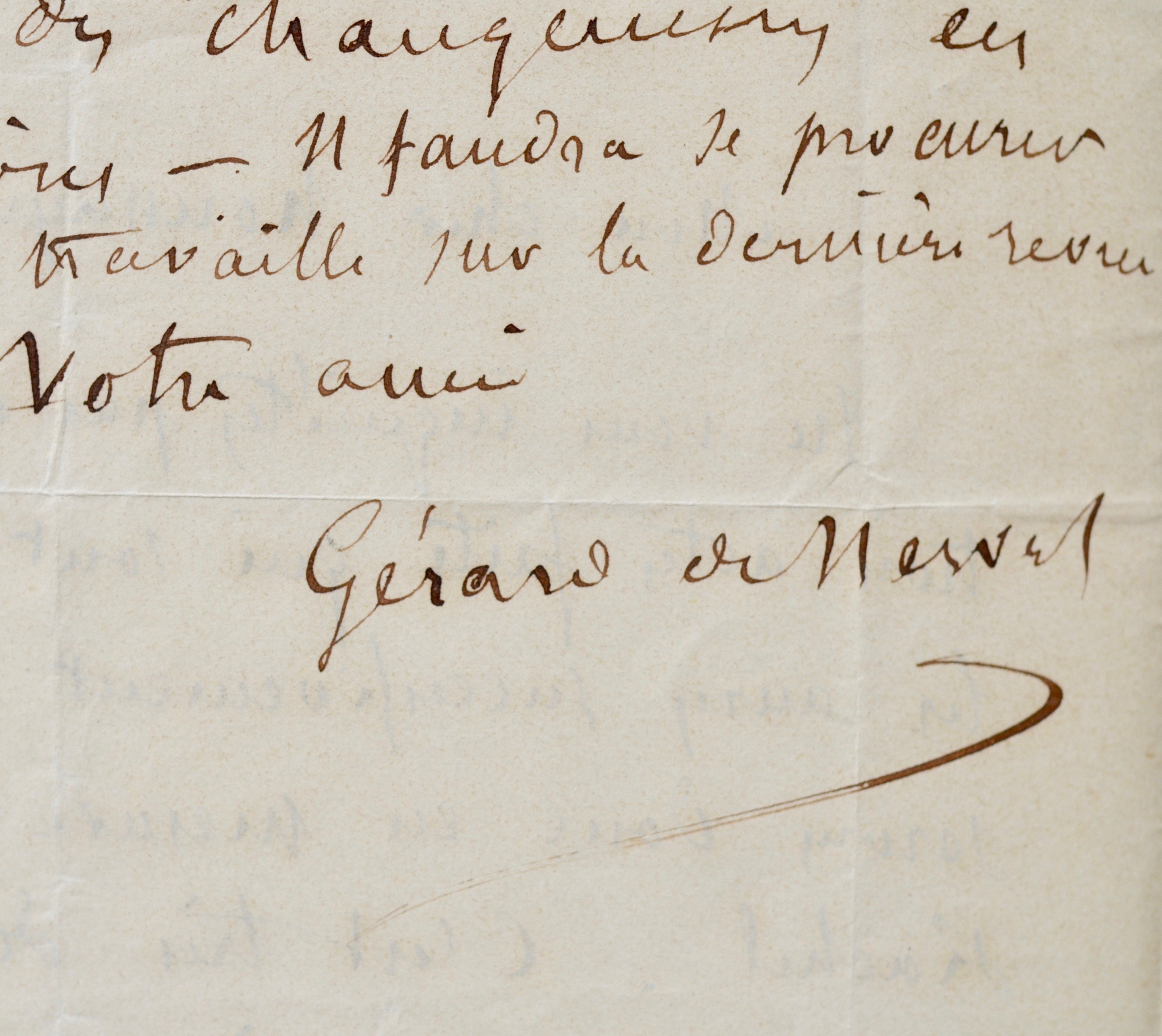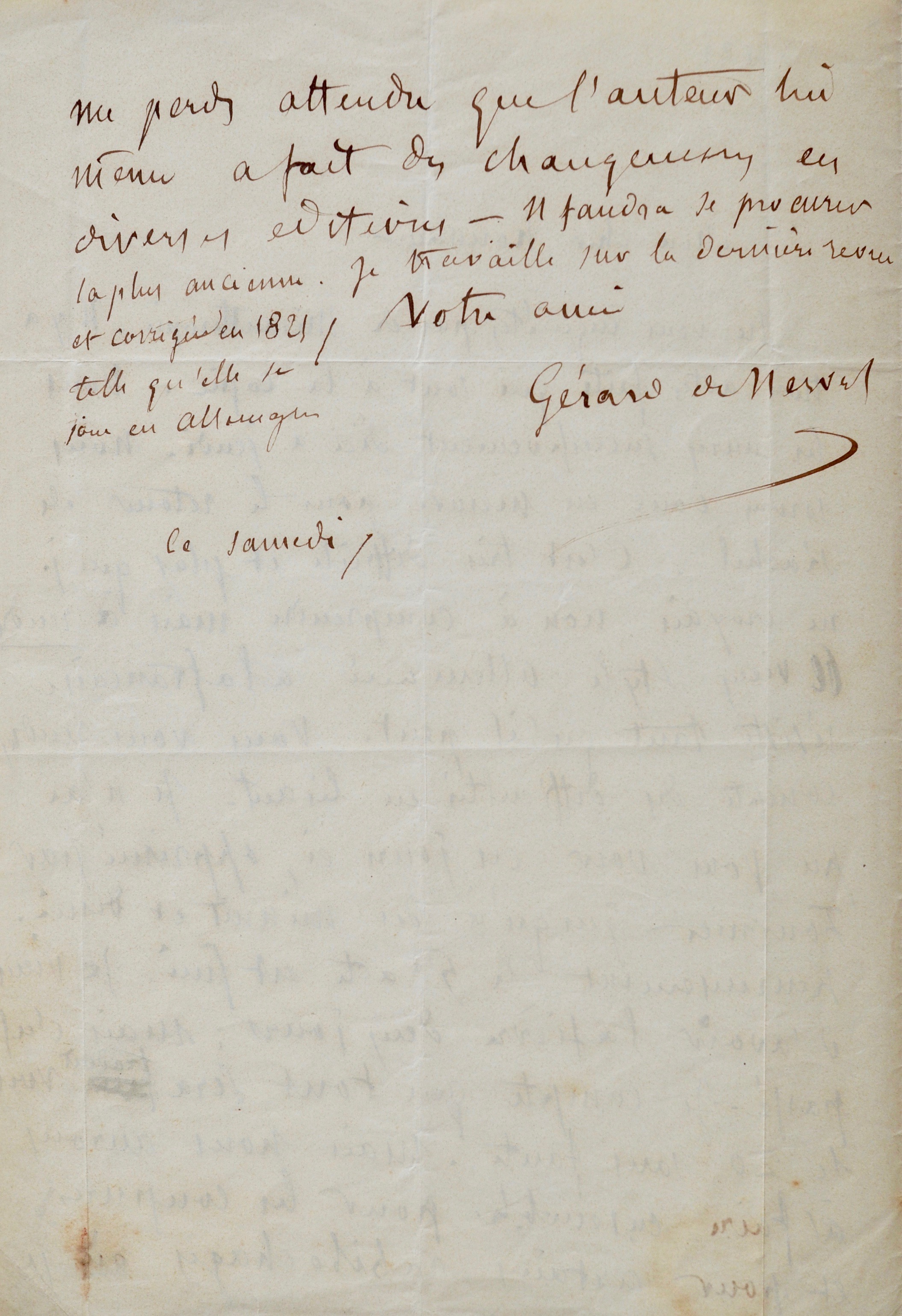 "Ne vous inquiétez pas de Misanthropie. Il y a 3 actes faits qui sont à la copie. Vous les aurez successivement d'ici à jeudi. Nous serons donc en mesure pour le retour de Rachel. C'est très difficile et plus que je ne croyais non à comprendre mais à rendre. Ce vieux style allemand à la française résiste tant qu'il peut. Vous vous rendrez compte des difficultés en lisant. Je n'ai pu vous voir ces jours-ci, opprimé par Fournier jusqu'à des minuit et demi. Heureusement le 5e acte est fini. Je viens d'avoir la fièvre deux jours ; mais c'est passé. Je compte que tout sera traduit vers le 20 sans faute. Mais nous aurons à faire ensemble pour les coupures et pour certains rabibochées où je me perds attendu que l'auteur lui même a fait des changements en diverses éditions. Il faudra se procurer la plus ancienne. Je travaille sur la dernière revue et corrigée en 1821, telle qu'elle se joue en Allemagne. Votre ami. Gérard de Nerval".