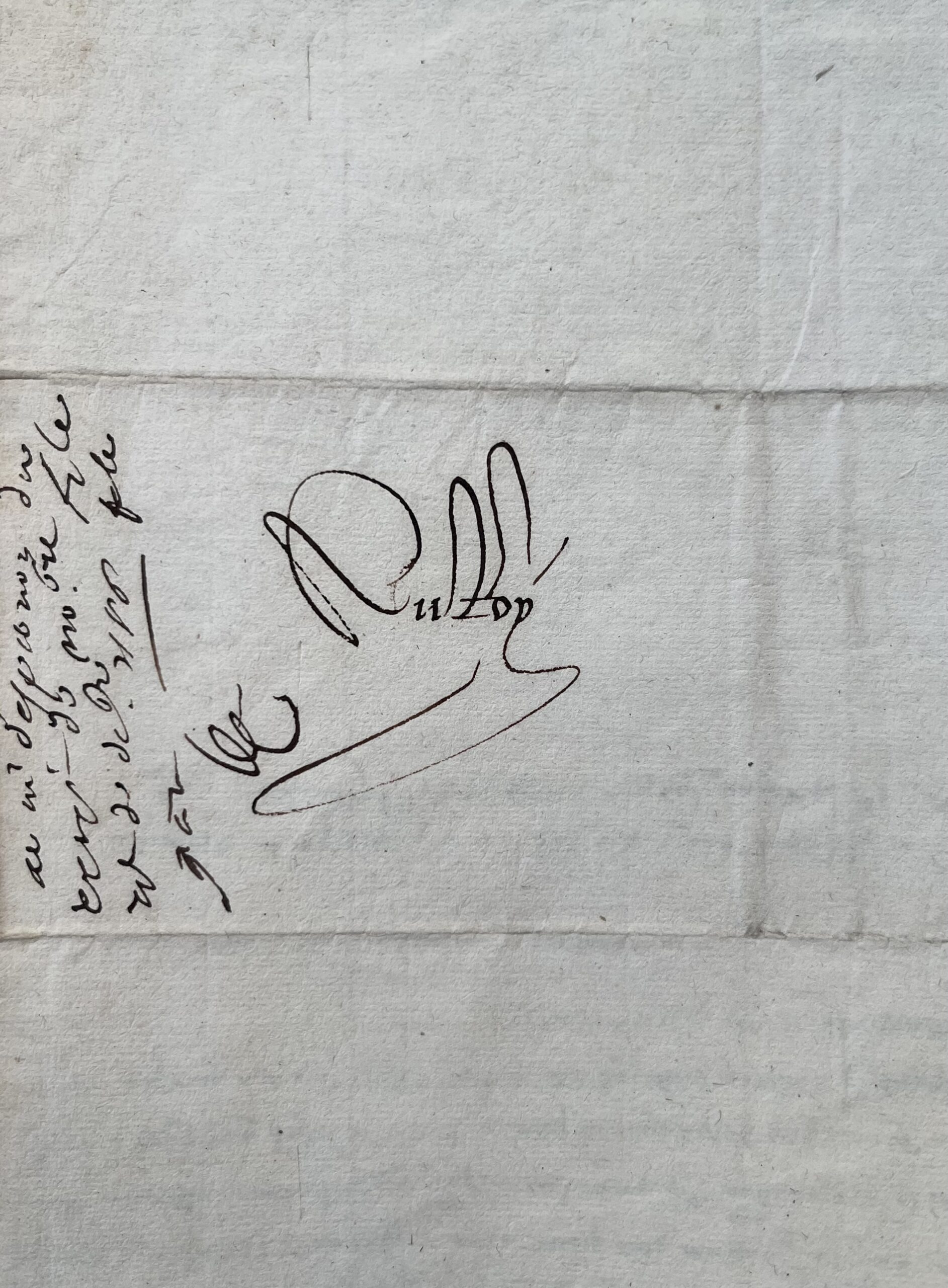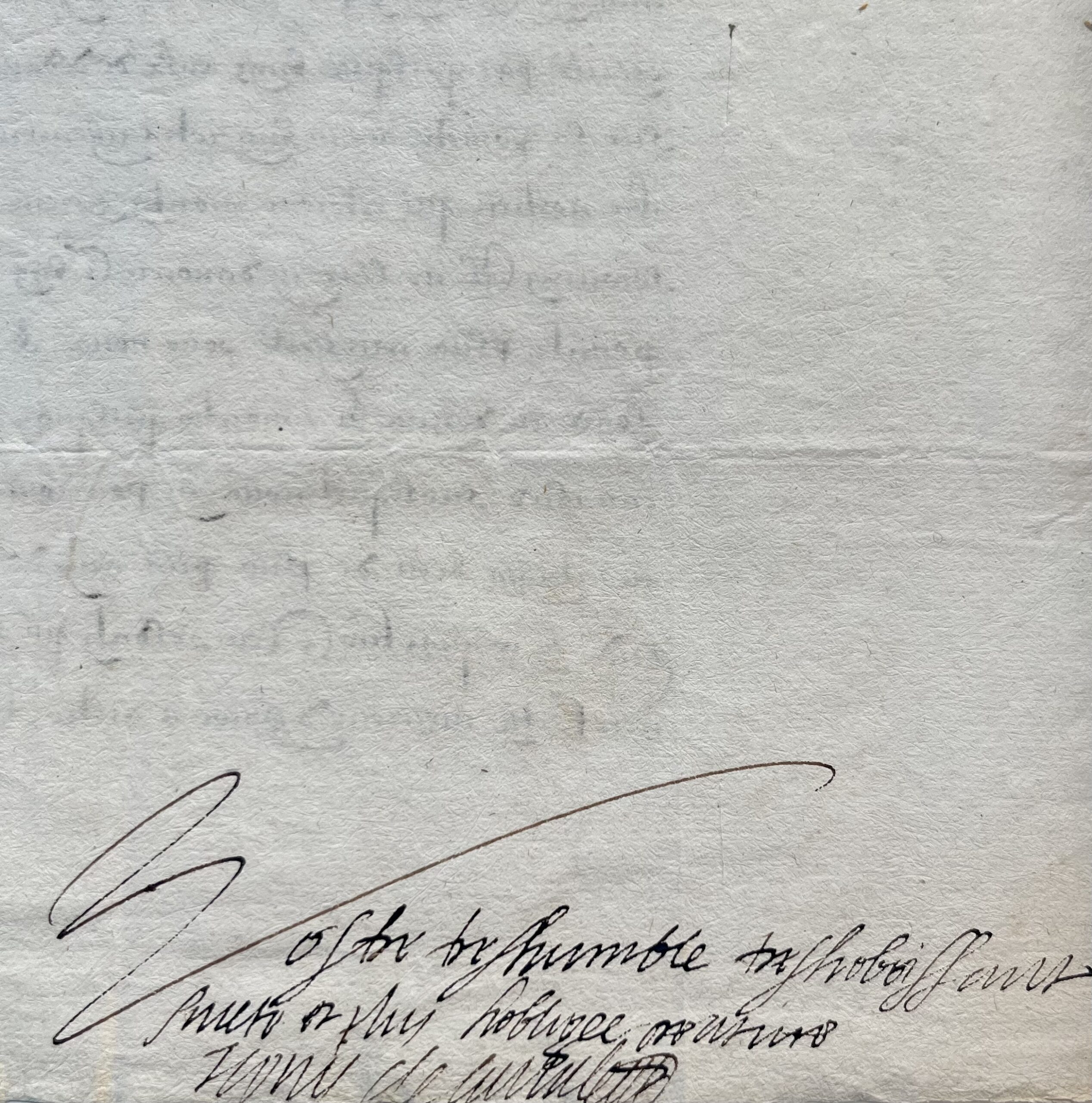 Compliment et signature autographes "Vostre tres humble tres obeissant et plus hobligee serviteur jlouis de lavalette".
