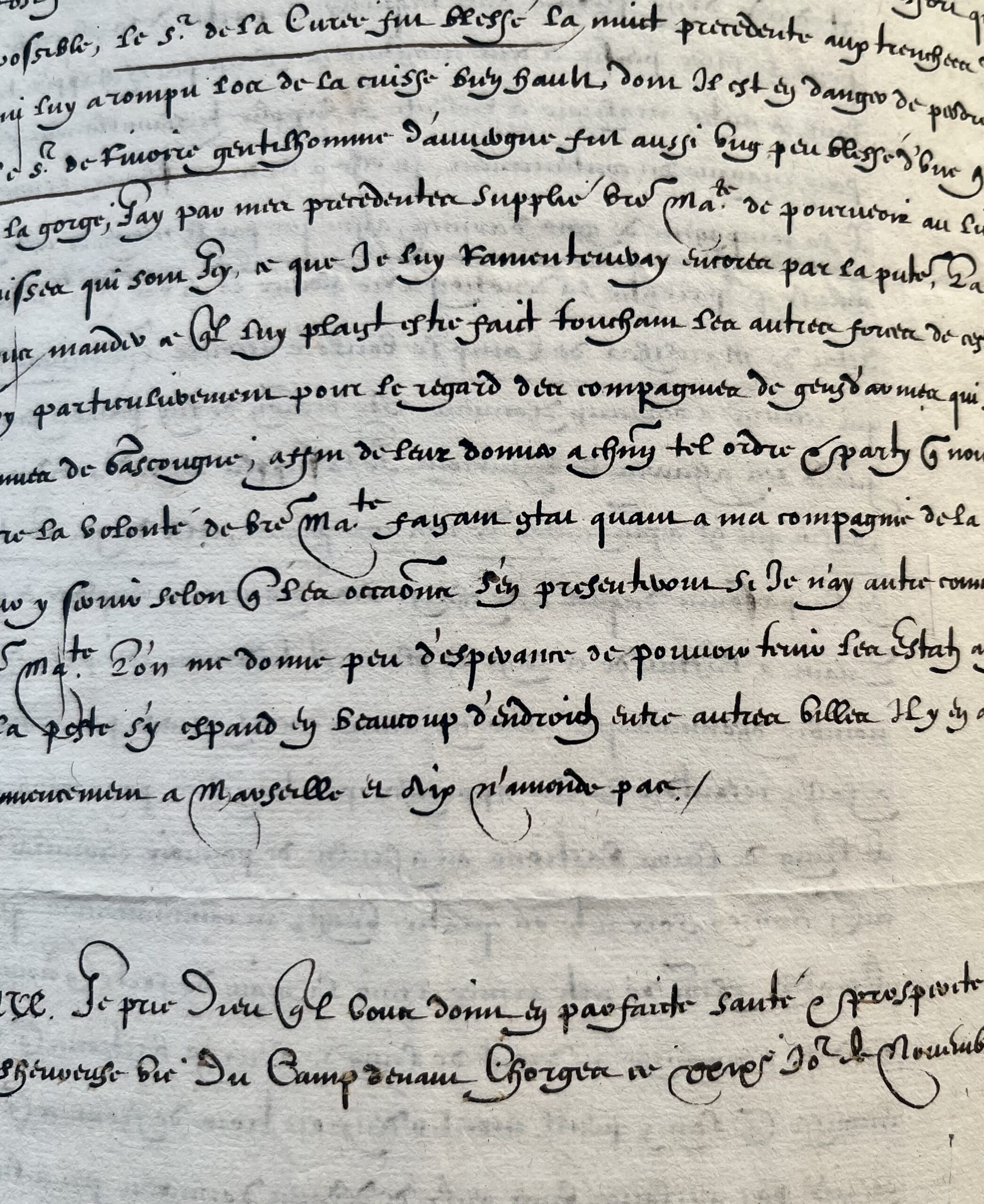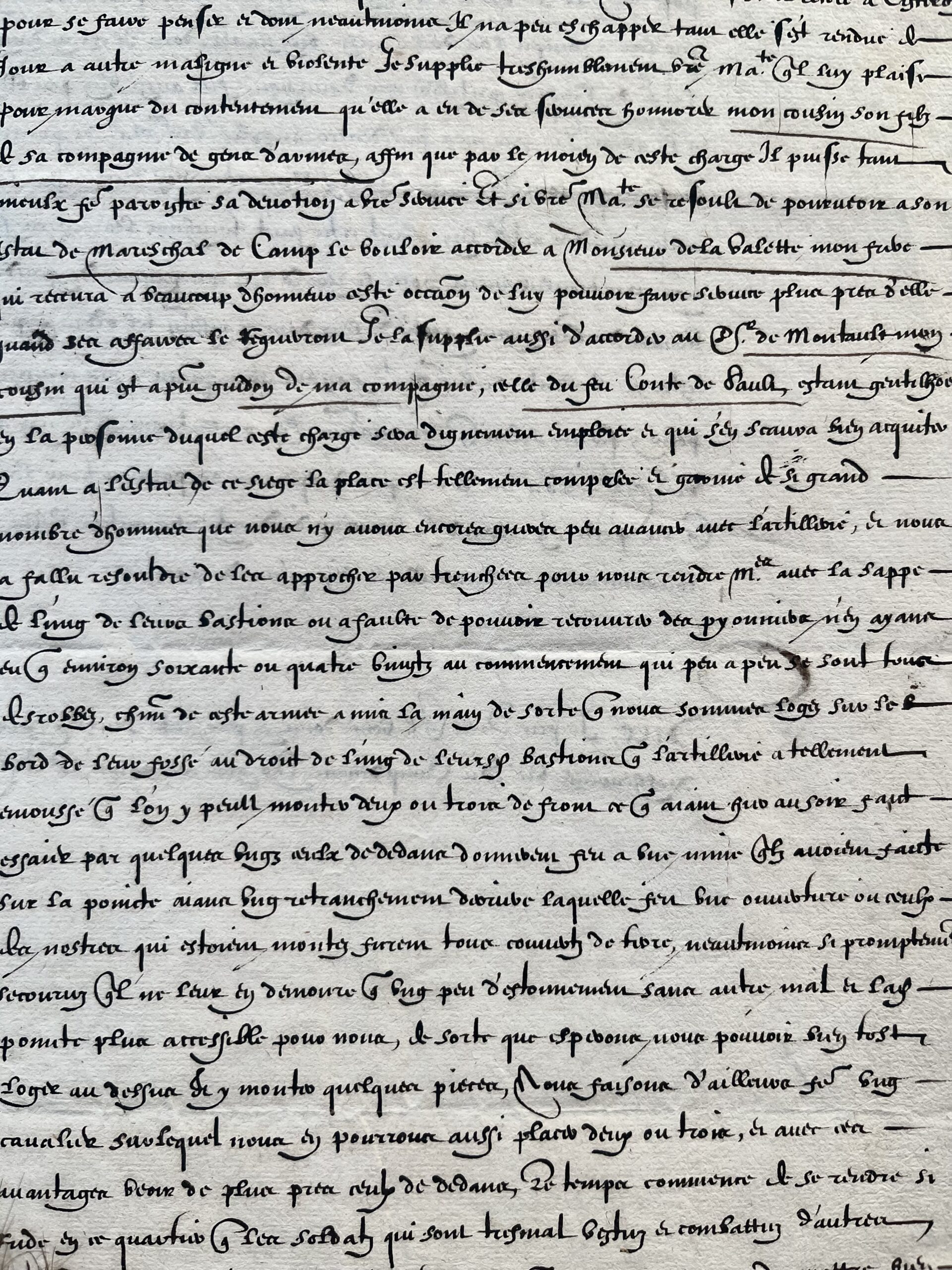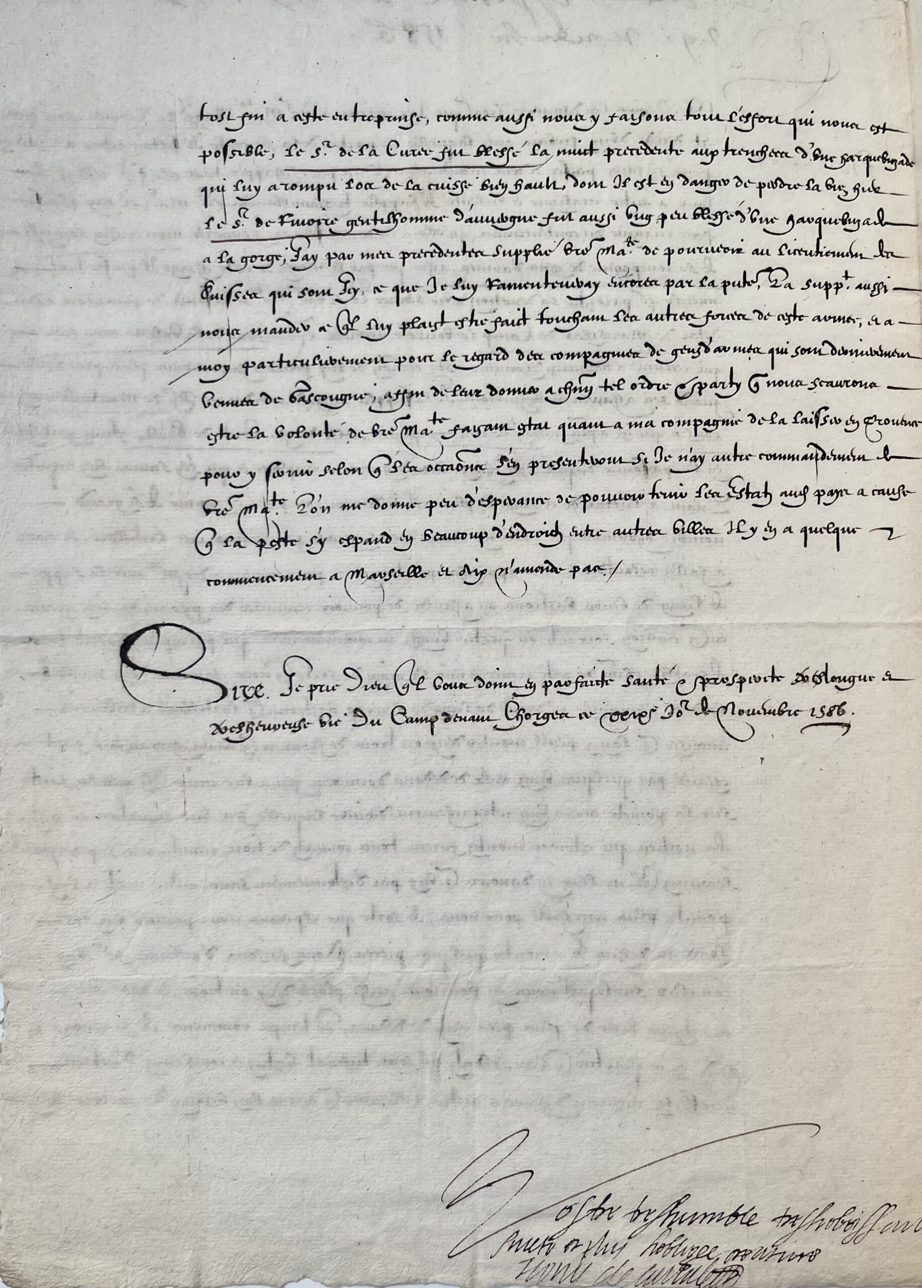 Quant à lestat de ce siege la place est tellement composée et garnie de si grand nombre d’hommes que nous ny avons encore guère peu avancé avec l’artillerie, et nous a fallu resouldre de les approcher par tranchées pour nous rendre maistres avec la sappe de lung de leurs bastions ou a faulte de pouvoir recouvrer des pyonnières n’en ayant eu qu’environ soixante ou quatre vingts au commencement qui peu à peu se sont tous desrobbéz, chacun de ceste armée a mis la main de sorte que nous sommes logés sur le bord de leur fossé au droict de l’ung de leurs bastions que l’artillerie a tellement émoussé que l’on peult monter deux ou trois de front et que aiant hier au soir faict essaier par quelques ungz ceulx de dedans donnèrent feu à une mine quilz avoient faicte sur la poincte aiant un retranchement derrière laquelle feu une ouverture ou ceulx des nostres qui estoient montez furent tous couvertz de terre, neantmoins si promptement secouruz quil ne leur en demeure que ung peu d’estonnement sans autre mal et ladicte poincte plus accessible pour nous, de sorte que esperons nous pouvoir bien tost loger au dessus et y monter quelques pièces. Nous faisons d’ailleurs faire ung cavalier sur lequel nous en pourrons aussy placer deux ou trois, et avec ces avantages veoir de plus près ceulx de dedans. Le temps commence de se rendre si rude en ce quartier que les soldatz qui sont tres mal vestuz et combattuz d’autres necessitez, meurent d’heure à autre, tellement que avons bon besoing de mettre bien tost fin a ceste entreprinse, comme aussy nous y faisons tout l’esfort qui nous est possible, le sieur de La Curée fust blessé la nuict précédente aux tranchées d’une arquebuzade qui luy a rompu l’os de la cuisse bien hault dont il est en danger de perdre la vie, hier le Sr de Rivoire gentilhomme d’auvergne fut aussi ung peu blessé d’une arquebuzade à la gorge. J’ay par mes précédentes supplié vostre majesté de pourvoir au licentiement des Suisses qui sont icy, ce que je luy ramenteneray encore par la présente, la suppliant aussy nous mander ce qu’il luy plaist estre faict touchant les autres forces de ceste armée, et à moy particulièrement pour le regard des compagnies des gens d’armes qui sont dernièrement venues en Gascoigne, affin de leur donner tel ordre et party que nous scaurons estre la volonté de vostre majesté faisant estat quant à ma compagnie de la laisser en Provence pour y servir selon que les occasions se présenteront si je n’ay autre commandement de vostre Majesté l’on me donne peu d’espérance de pouvoir tenir les estatz audit pays à cause que la peste s’y respand en beaucoup d’endroictz entre autres villes il y en a quelque commencement à Marseille et Aix n’amende pas. Sire, je prie dieu quil vous (?) en parfaicte santé et prospérité de tres longue et tres heureuse vie. Du camp devant Chorges ce xxixe jour de novembre 1586".