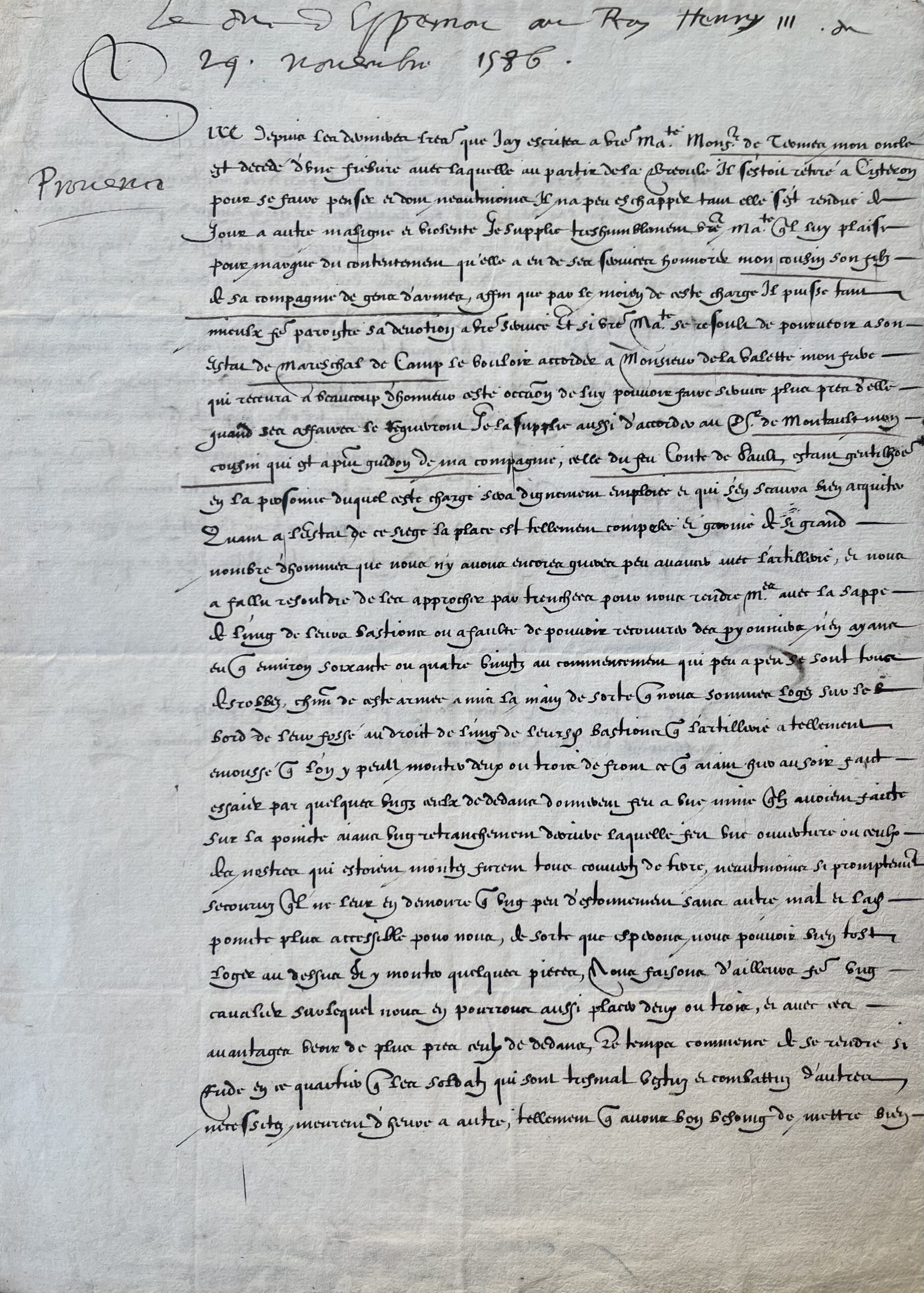 "Sire, depuis les dernières lettres que jay escriptes à vostre Majesté, mon. de Termes mon oncle est décédé d’une fiebvre avec laquelle au partir de la Breoule [La Breole, Alpes-de-Haute-Provence ; en octobre 1586, le duc d’Epernon fit le siège du château défendu par les Protestant de Lesdiguières] il sestoit retiré à Cisteron [Sisteron] pour se faire penser et dont neantmoins il n’a peu eschapper tant elle est rendue de jour à autre maligne et violente. Je supplie tres humblement vostre majesté quil luy plaise pour marque du contentement quelle a eu de ses services honorer mon cousin son filz de sa compagnie de gens darmes afin que par le moien  de ceste charge il puisse tant mieulx faire paroistre sa dévotion à vostre service et si vostre majesté se resoult de pourvoir à son estat de mareschal de camp le vouloir accorder à monsieur de La Valette mon frere [Bernard de Nogaret] qui recevra a beaucoup d’honneur ceste occasion de luy pouvoir faire service plus près d’elle quand ses affaires le requeront. Je la supplie d’accorder aussy au Sieur de Montault mon cousin qui est à présent guidon de ma compagnie, celle du feu comte de Sault, estant gentilhomme en la personne duquel ceste charge sera dignement emploiée et s’en scaura bien dignement acquiter.