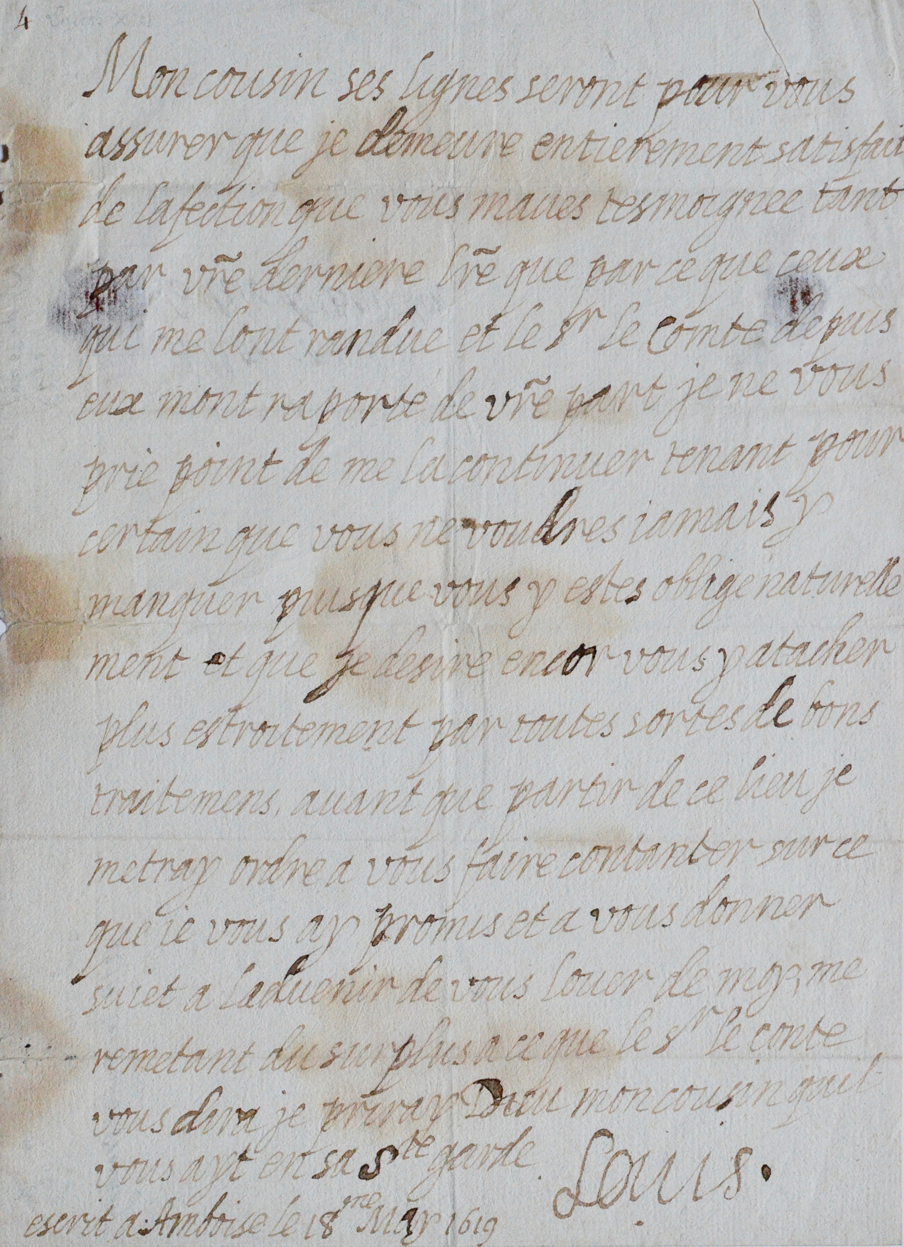 Transcription (orthographe respectée) : « Mon cousin ses lignes seront pour vous assurer que je demeure entierement satisfait de lafection que vous maves tesmoignee tant par v[ot]re derniere lettre que par ce que ceux qui me lont randue et le Sr Le Comte depuis eux mont raporté de v[ot]re part je ne vous prie point de me la continuer tenant pour certain que vous ne voudres iamais y manquer puisque que vous y estes obligé naturellement et que je desire encor vous y atacher plus estroitement par toutes sortes de bons traitemens, avant que partir de ce lieu je metray ordre a vous faire contanter sur ce que ie vous ay promis et a vous donner suiet a ladvenir de vous louer de moy, me remetant du surplus a ce que le Sr le conte vous dira je priray Dieu mon cousin quil vous ayt en sa s[ain]te garde ».