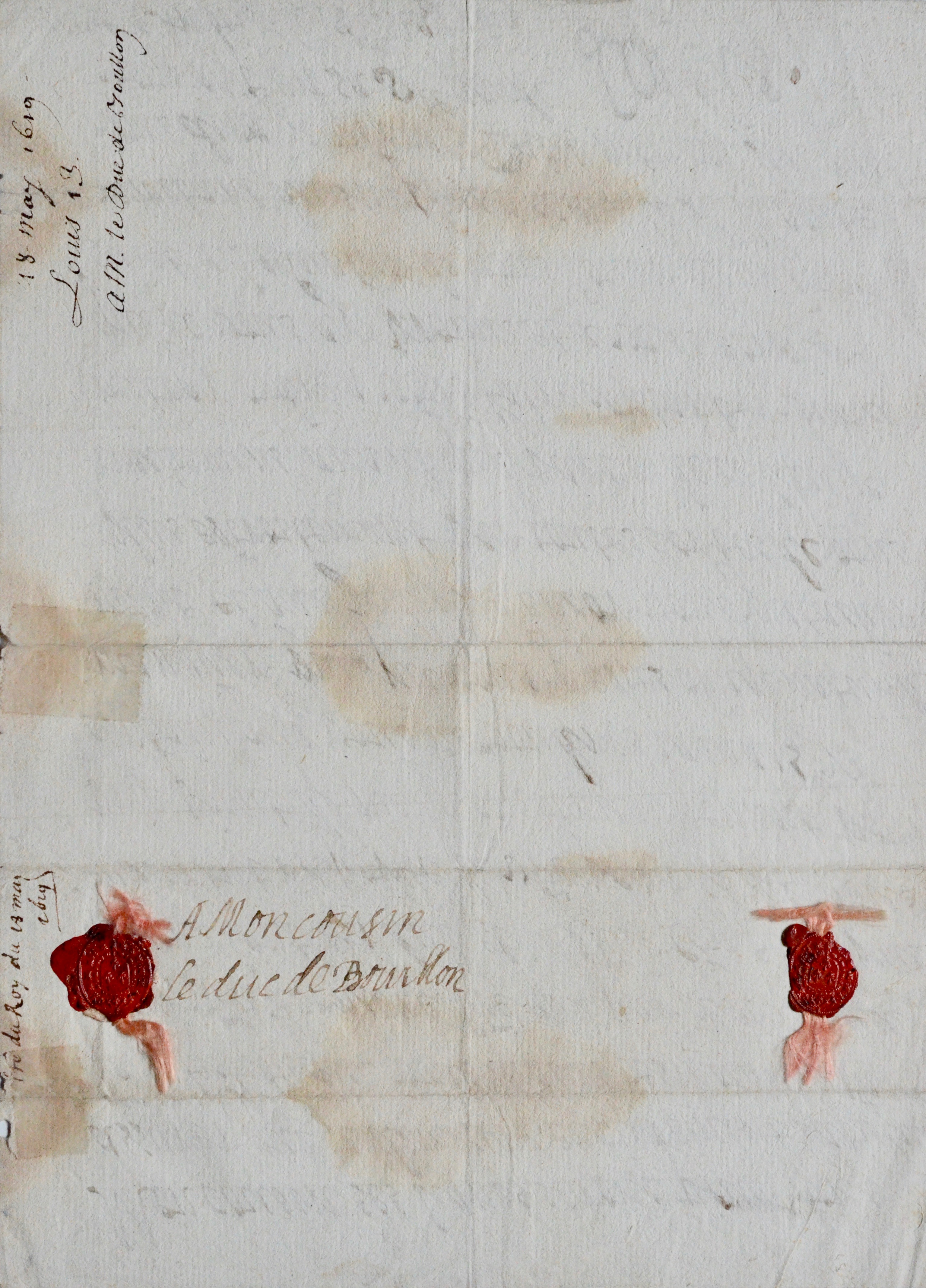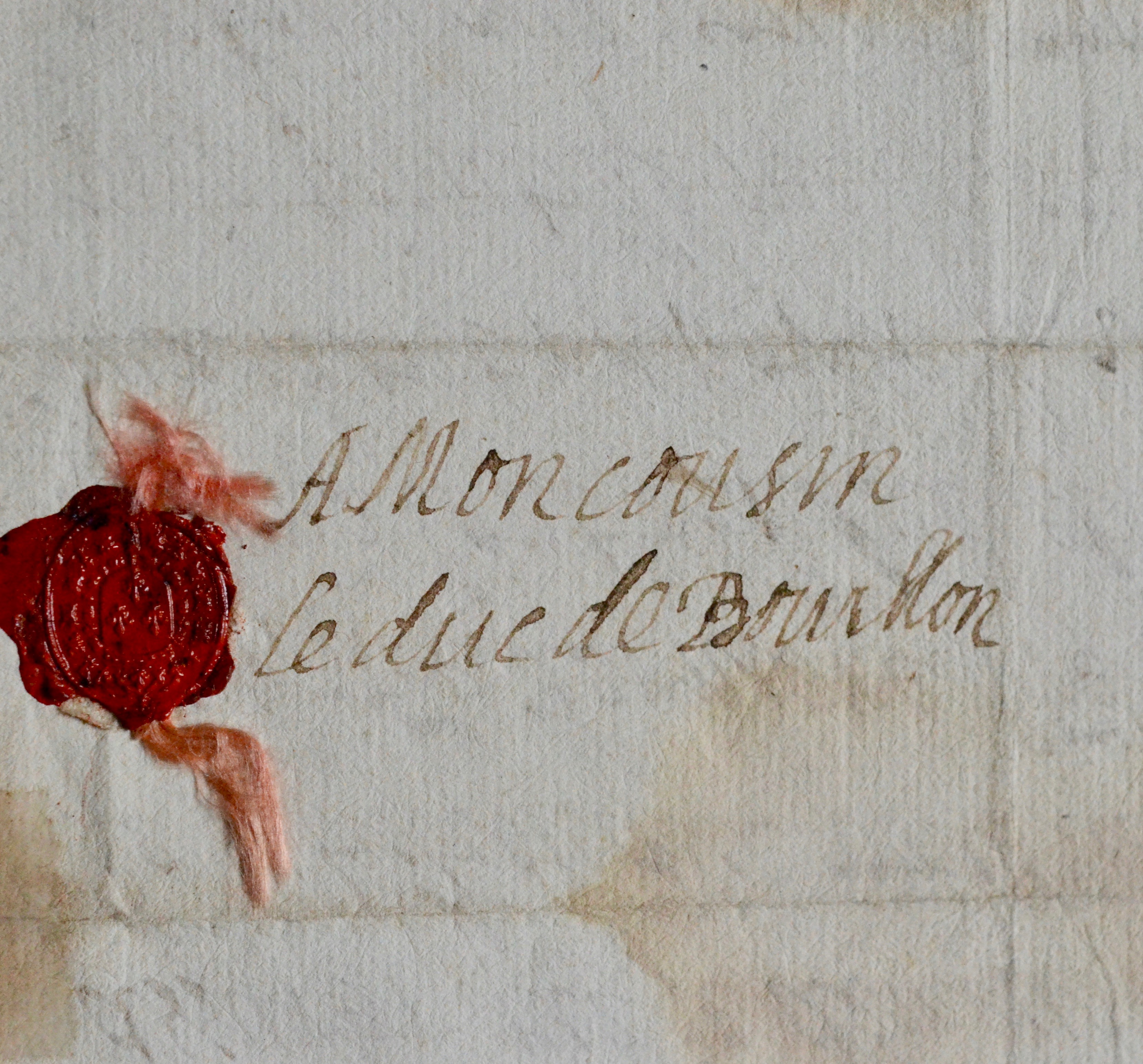 Adresse au verso "A mon cousin le duc de Bouillon" avec cachets de cire rouge aux armes royales et lacs de soie rose.