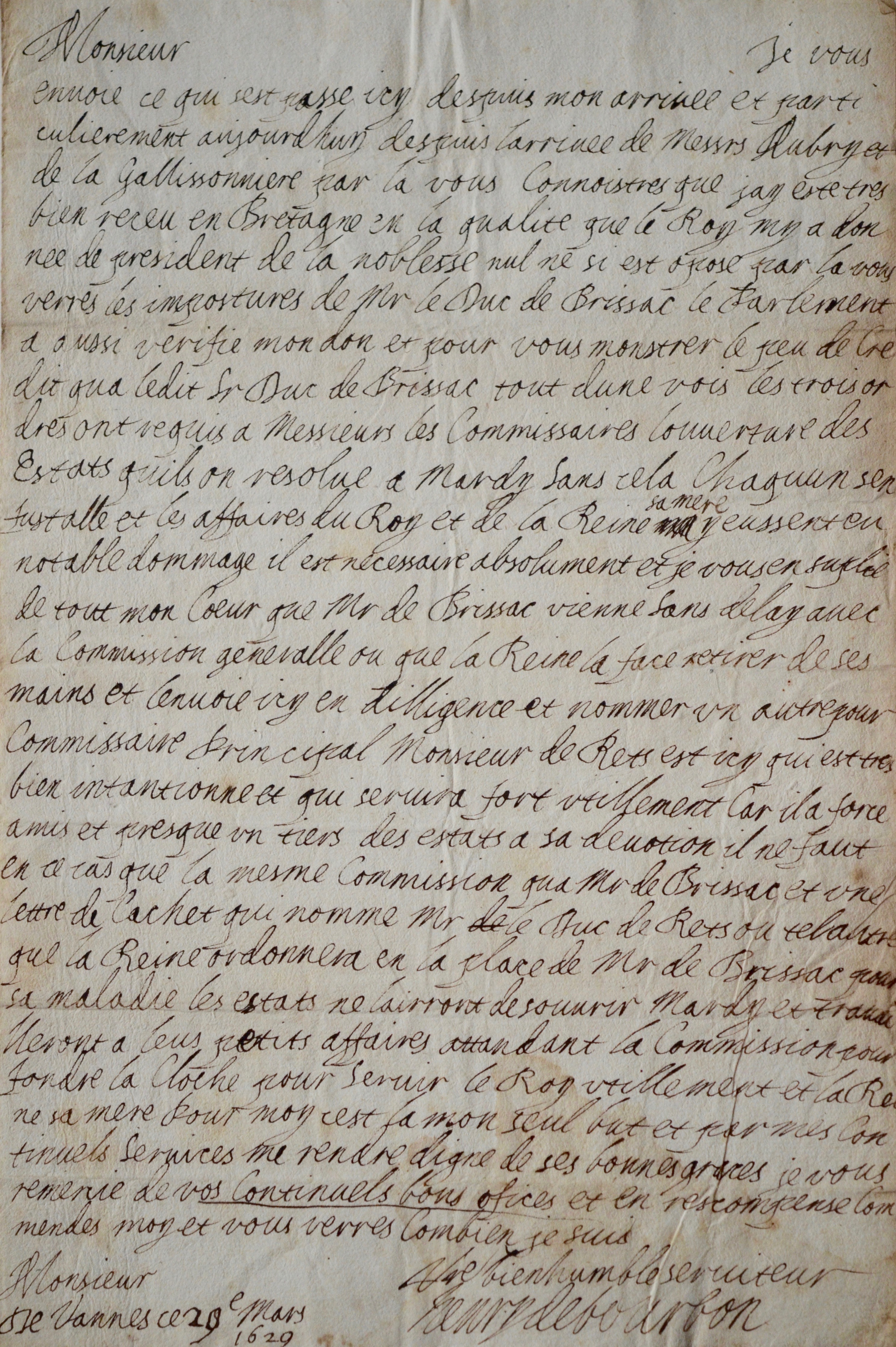 "[...]j'ay este tres bien receu en Bretagne en la qualité que le Roy my a donnee de president de la noblessenul ne si est oppose par la vous verres les impostures de Mr le Duc de Brissac le parlement a aussi verifie mon don et pour vous monstrer le peu de credit qua ledit Sr Duc de Brissac tout dune vois les trois ordres ont requis a Messieurs les Commissaires l’ouverture des Estats qu'ils on resolue a Mardy sans cela chaquun sen fust allé et les affaires du Roy et de la Reine sa mere y eussent eu notable dommage il est necessaire absolument et je vous en supplie de tout mon coeur que Mr de Brissac vienne sans delay avec la Commission generalle ou que la Reine la face retirer de ses mains et l'envoie icy en dilligence et nommer un autre pour Commissaire principal Monsieur de Rets est icy qui est tres bien intantionne et servira fort vaillement car il a force amis et presque un tiers des estats a sa dévotion [...]".