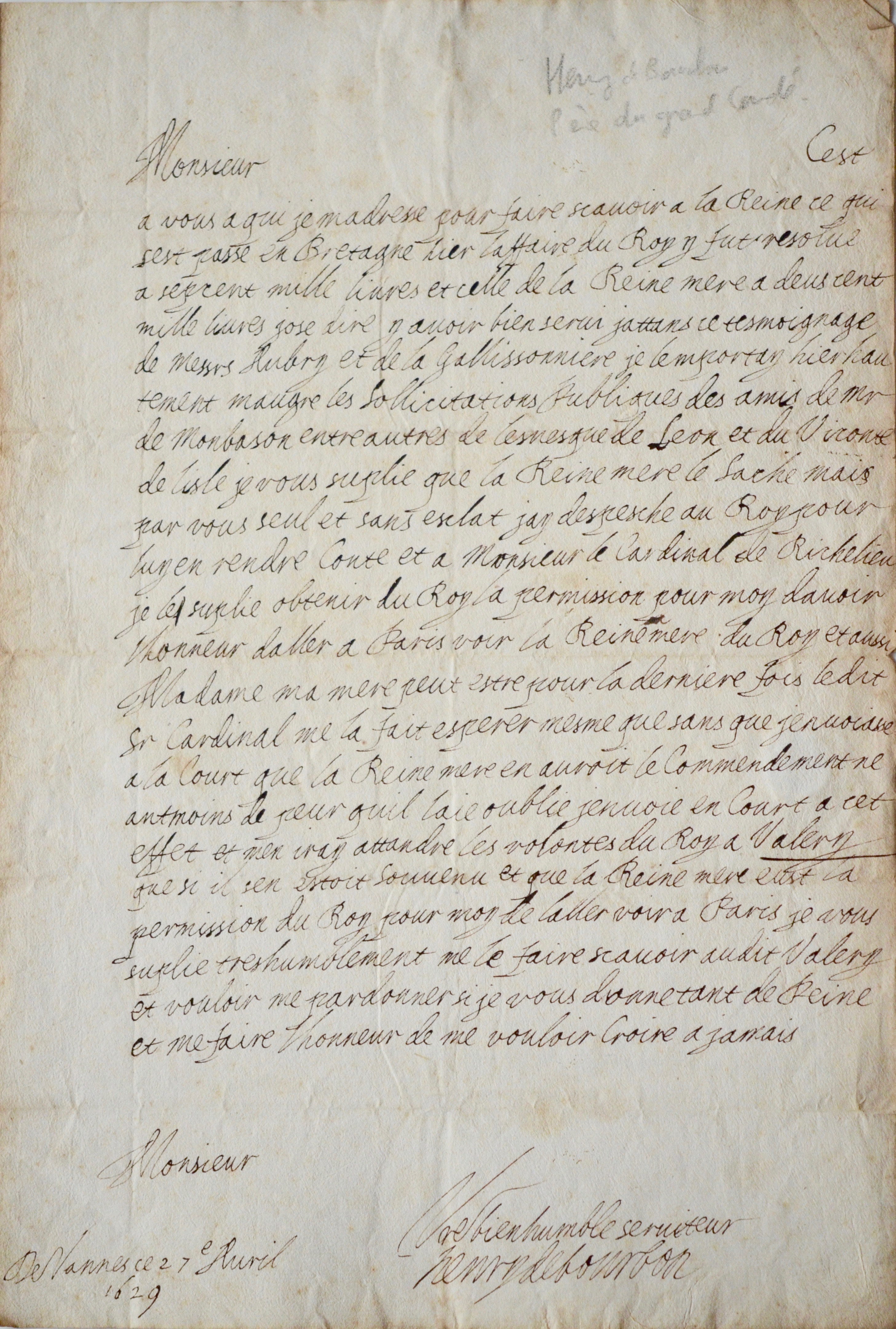 "C'est a vous a qui je m'adresse pour faire scavoir a la Reine ce qui s'est passe en Bretagne hier l'affaire du Roy y fut resolue a sept cent mille livres et celle de la Reine mere a deus cent mille livres j'ose dire y avoir bien servij'attans ce tesmoignage de messire Aubry et de la Gallissonniere [...]". Il évoque M. de Monbason, l'évêque de Leon et le vicomte de Lisle. "Je vous supplie que la Reine mere le sache mais par vous seul et sans esclat jay despesche au Roy pour lui en rendre conte et a Monsieur le Cardinal de Richelieu [...]". Il souhaite se rendre à Paris pour s'entretenir avec la Reine mère et avec sa propre mère "peut estre pour la dernière fois [...]". En effet, sa mère, Charlotte-Catherine de La Trémoille, princesse de Condé, mourut quelques mois plus tard, en août 1629.