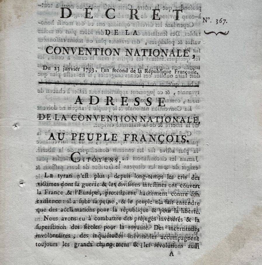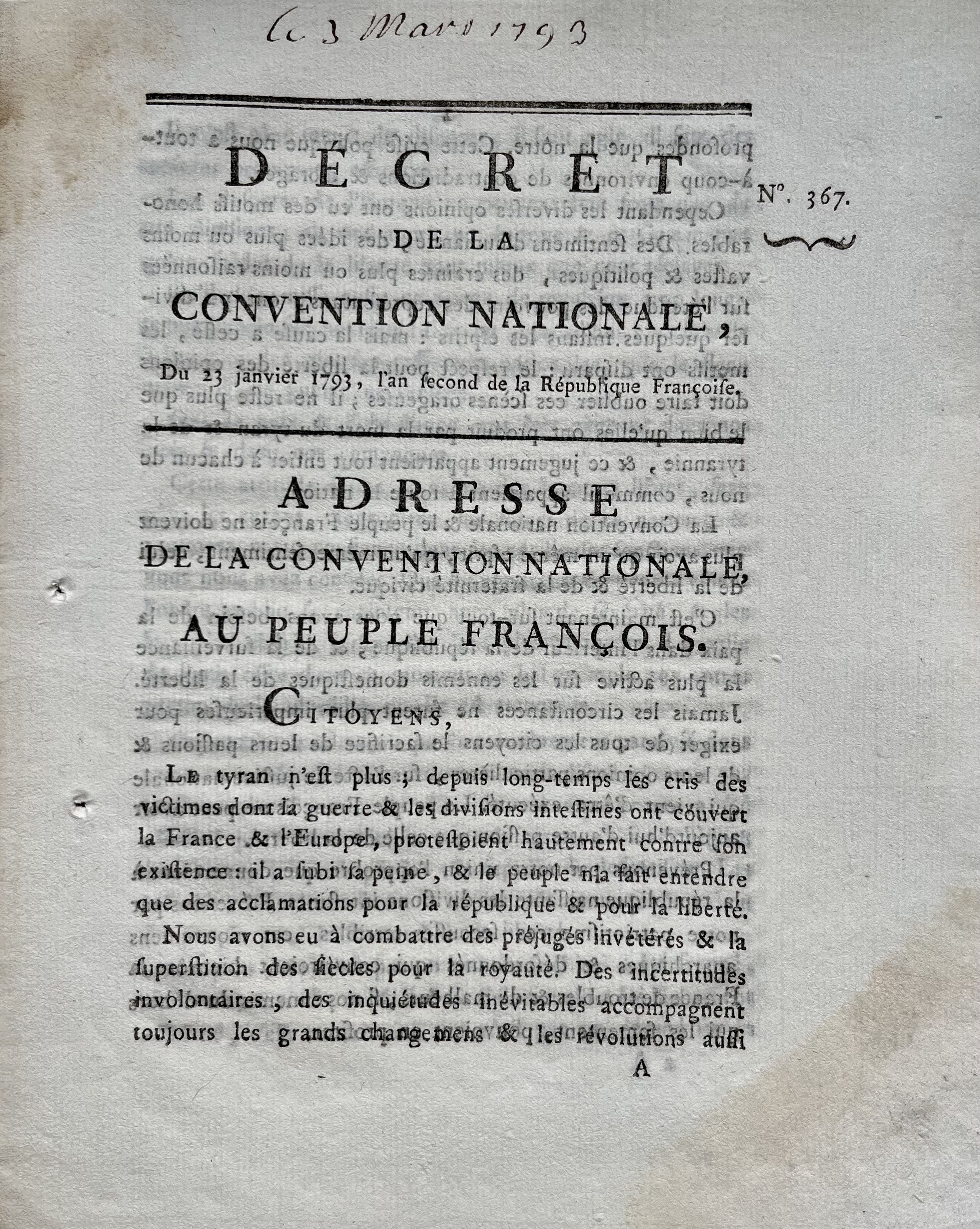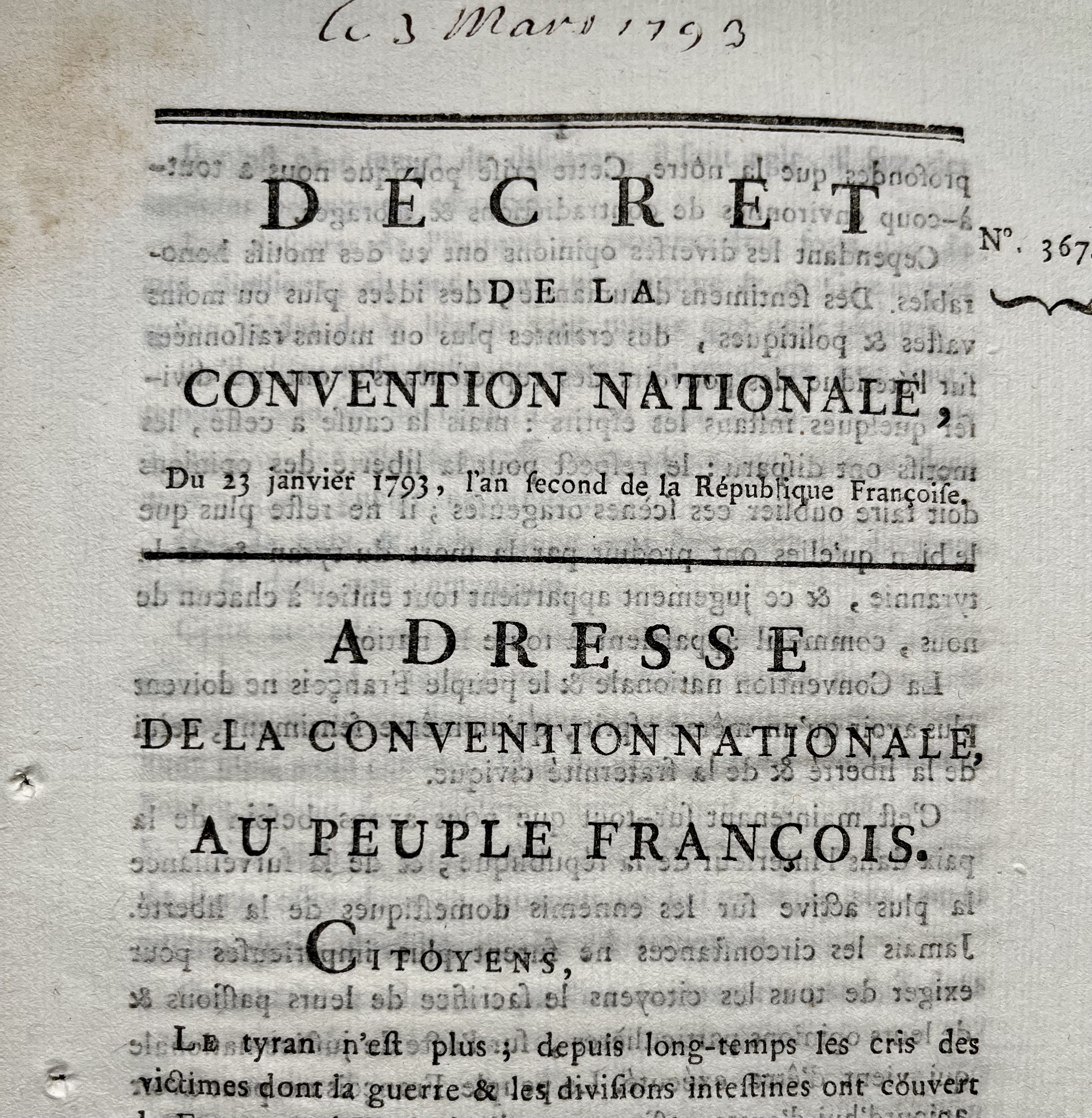 Décret de la Convention nationale du 23 janvier 1793 sur l'exécution de Louis XVI, contenant "l'Adresse de la Convention Nationale au Peuple François".