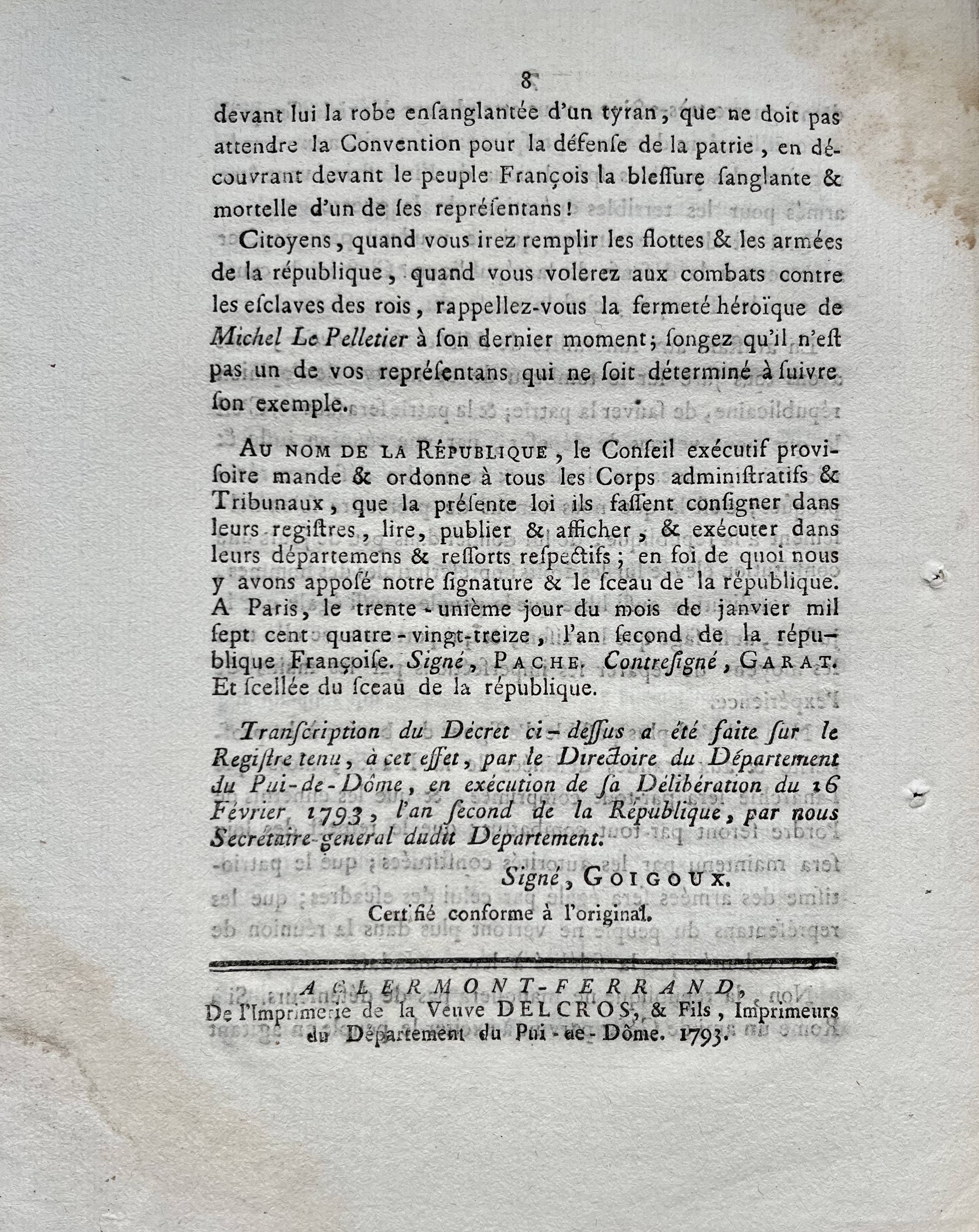"Citoyens, le tyran n'est plus ; depuis longtemps les cris des victimes dont la guerre & les divisions intestines ont couvert la France & l'Europe, protestaient hautement contre son existence : il a subi sa peine& le peuple n'a fait entendre que des acclamations pour la république & pour la liberté […]".