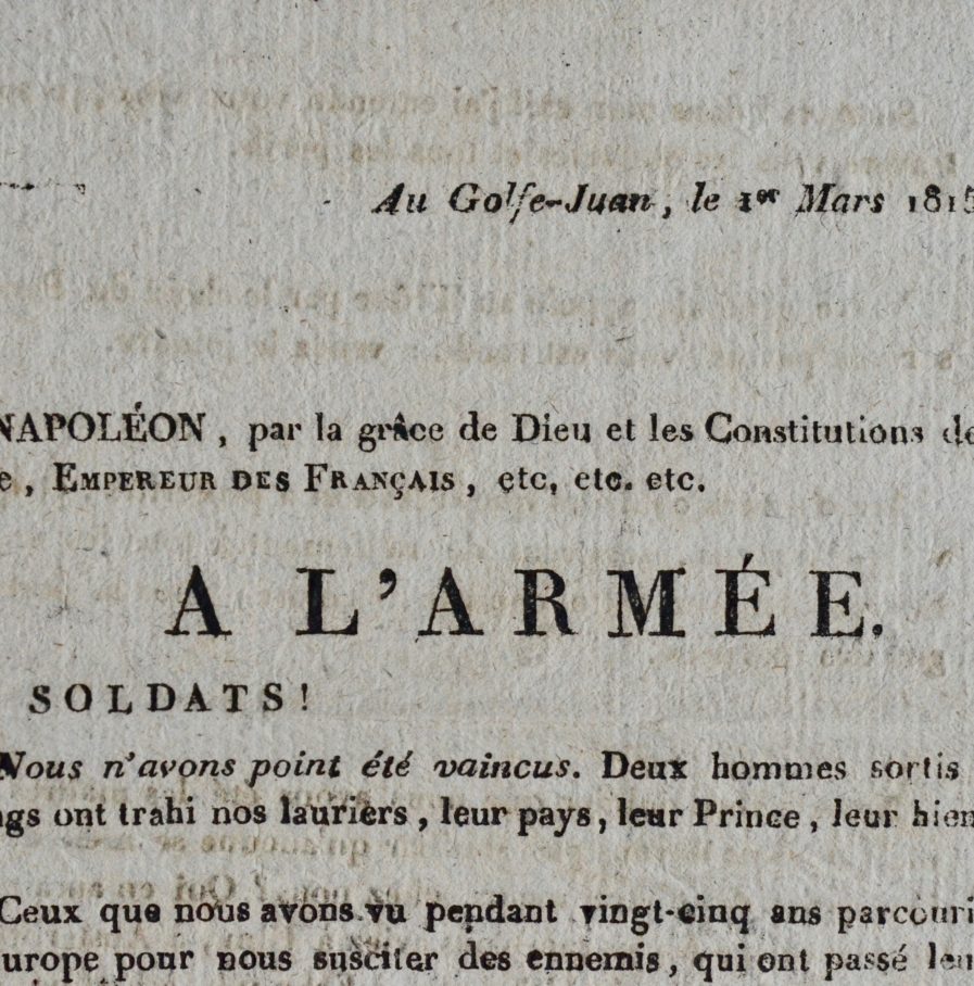 Imprimé de la célèbre "Proclamation de Golfe Juan", faite par Napoléon, à l'armée, le 1er Mars 1815, après son évasion de l'île d'Elbe et son débarquement à Golfe-Juan.