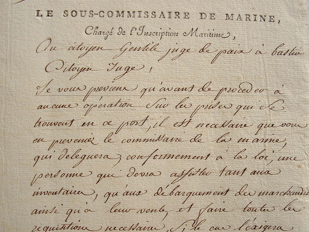 Copie d'une lettre du sous-commissaire de marine chargé de l'inscription maritime. «Je vous préviens qu'avant de procéder à aucune opération sur les prises qui se trouvent en ce port, il est nécessaire que vous en préveniez le commissaire de la marine qui délèguera, conformément à la loi, une personne qui devra assister tant aux inventaires qu'au débarquement des marchandises ainsi qu'à leur vente, et faire toutes les réquisitions nécessaires, si le cas l'exigera, et s'il y avoit déjà quelques opérations de commencées, elles deviendraient nulles, faute de cette formalité [...]».
