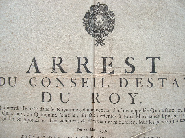 "Arrest du Conseil d'Etat du Roy qui interdit l'entrée dans le royaume d'une écorce d'arbre appellée Quina faux, ou faux Quinquina, ou Quinquina femelle ; Et fait deffenses à tous marchands épiciers, droguistes et apoticaires d'en acheter & d'en vendre ni débiter, sous peines y portées".