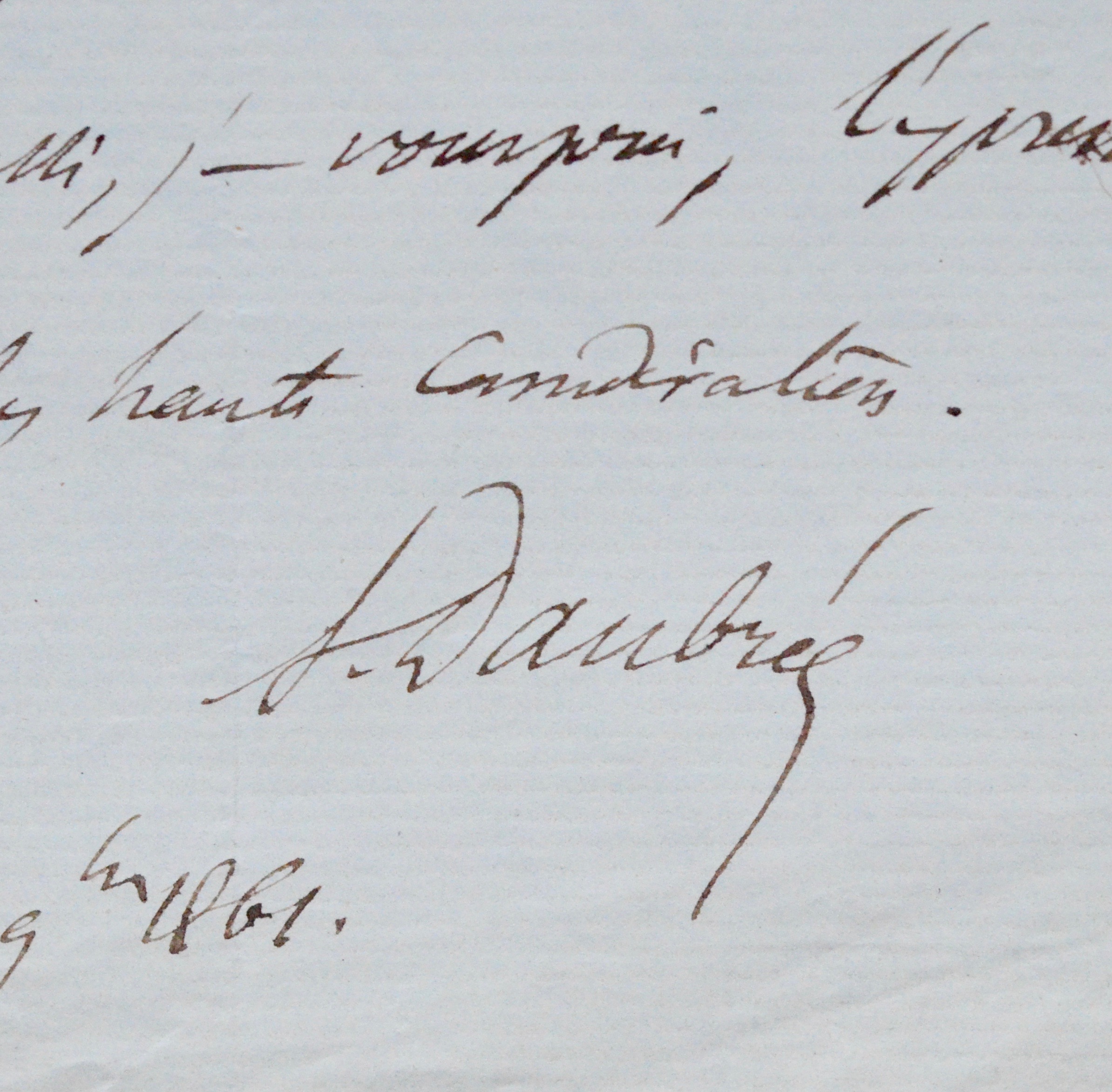 Bel et intéressant ensemble composé de 10 L.A.S., 1 L.S. et 2 cartes de visite autographes du géologue et minéralogiste Auguste Daubrée, adressées à différents correspondants : l’astronome Hervé Faye, Mme d'Albuquerque, Albert Juncker, des « illustre » et « honoré » confrères, etc.).