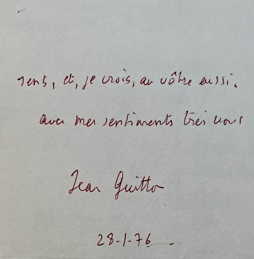 Guitton a ajouté en marge "[...] Voici mon texte sur Pascal. Pourriez-vous m'envoyer deux jeux d'épreuves ? Car cela me servirait pour préparer le "discours" de Clermont. JG [...] 1962".