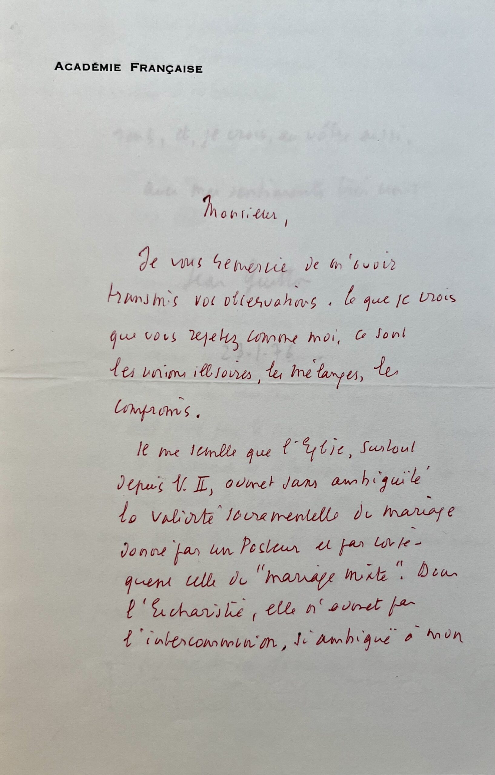 Il est joint une lettre autographe signée de Jean Guitton relative aux mariages mixtes (1976, 1 p. 1/2 in-8, en-tête de l'Académie française, stylo à bille rouge). "[...] Ce que je crois que vous rejetez comme moi, ce sont les unions illusoires, les mélanges, les compromis. Il me semble que l'Eglise, surtout depuis V[atican] II, admet sans ambiguïté la validité sacramentelle du mariage donné par un Pasteur et par conséquence celle du "mariage mixte" [...]".
